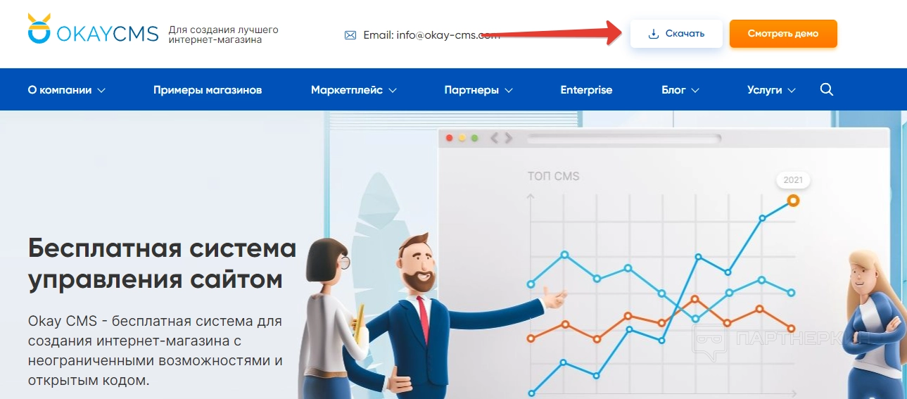 можно только после установки системы управления на хостинг. В первую очередь нужно обзавестись доменом и хостингом. Далее заходим на главную страницу сервиса и жмем на кнопку «Скачать».