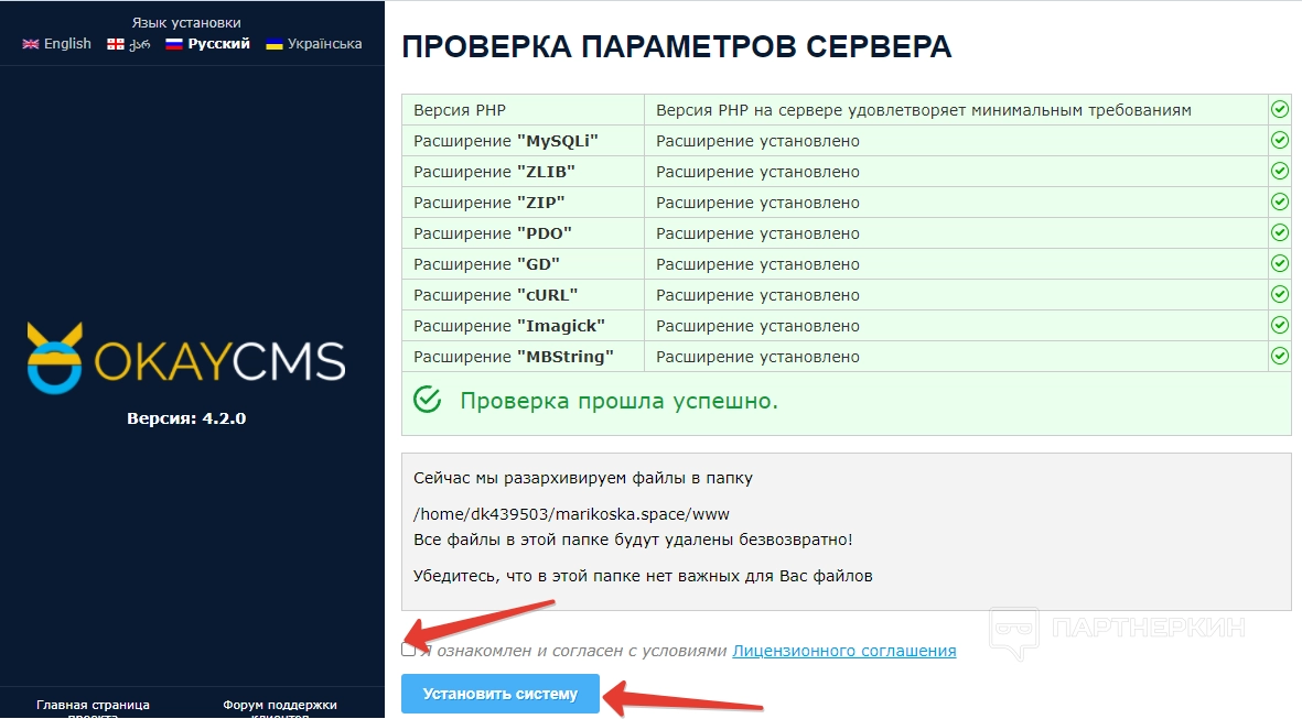 Содержимое архива следует загрузить на сервер, в корневую директорию своего сайта. После этого нужно перейти по адресу «http://домен сайта /install/» и запустить установщик системы управления. Когда откроется окно установки, соглашаемся с условиями пользования и жмем на кнопку «Установить систему».