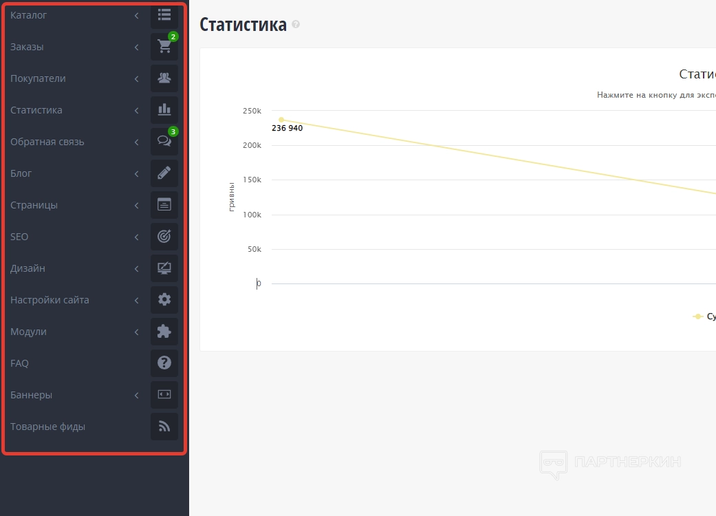 4. Статистика . В этом блоке отображается статистика и категоризация продаж.