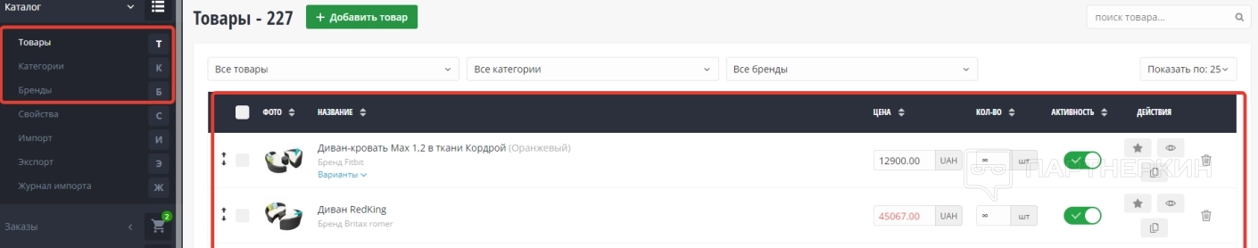 В качестве примера можно привести раздел «Каталог», в котором владелец интернет-магазина может выполнять следующие действия: