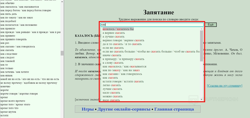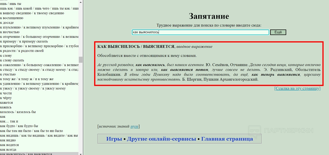 Сервис сразу показывает правильное написание выражения (вместе или раздельно) и указывает, нужно выделять его запятыми или нет.