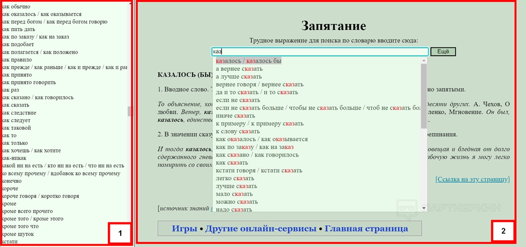 Онлайн-сервис простой в работе. Рабочее пространство состоит из двух полей. С левой стороны (область поменьше) располагаются все возможные выражения. Это что-то вроде словаря (1). Основное пространство занимает 2/3 экрана (2).