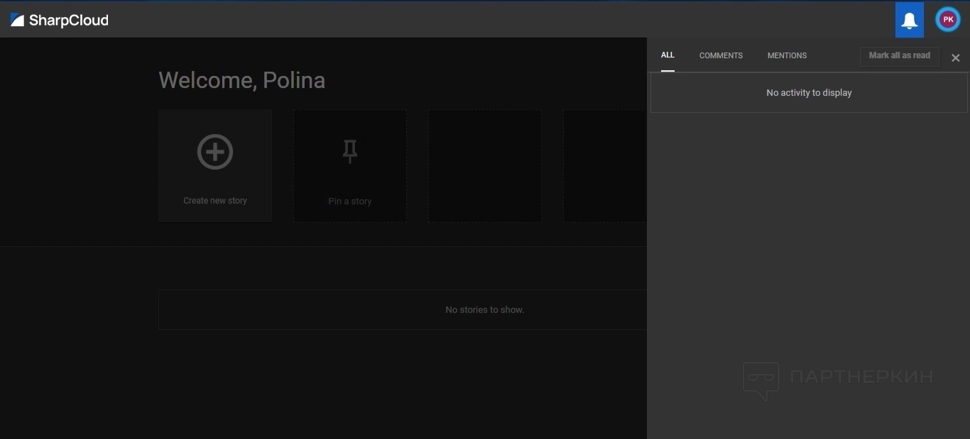 Значок колокольчика отвечает за уведомления. Ими могут быть оповещения конкретно пользователю, если был использован чат в проекте и личное обращение, а могут быть и системные от самой платформы для передачи полезной информации.