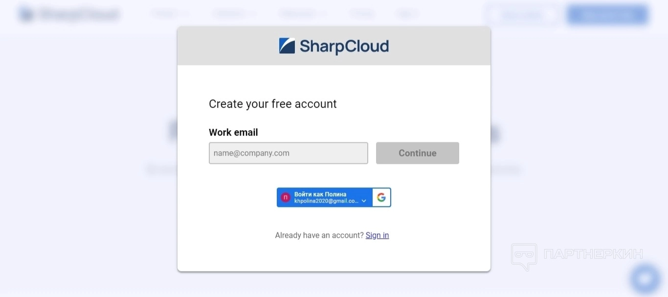 Войти в свою учетную запись можно с помощью указания своего рабочего email-ящика или с помощью готового аккаунта в Google.