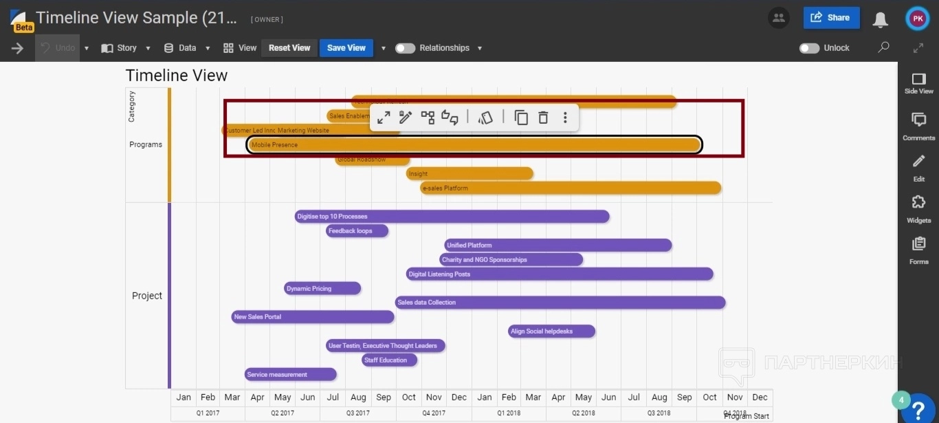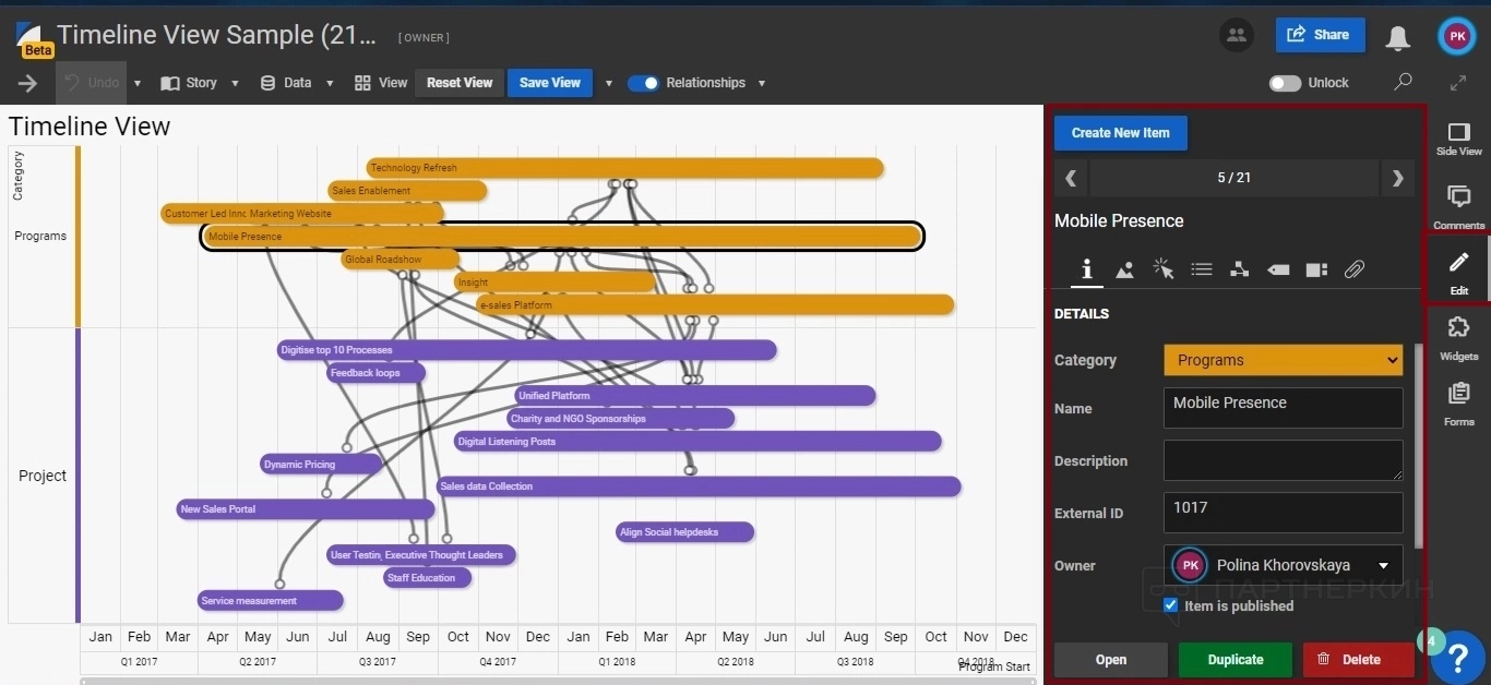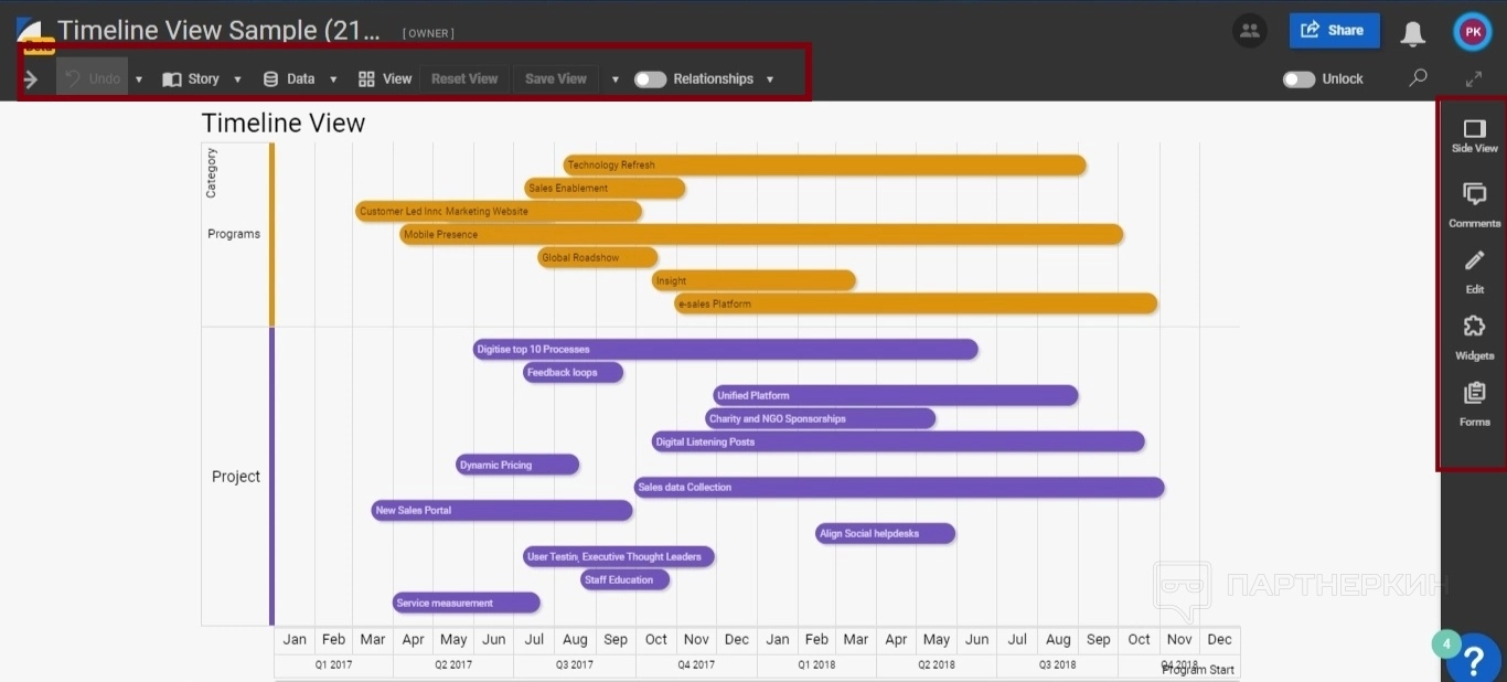 В вертикальном меню справа находятся разделы с комментариями к проекту, добавление виджетов в проект, а также дополнительных форм и данных.