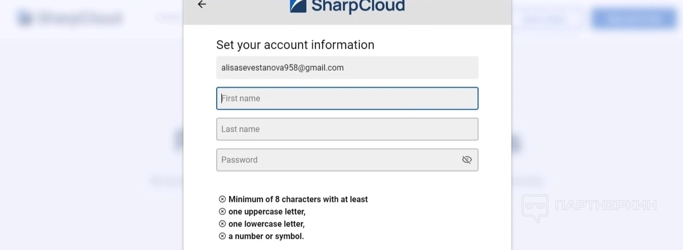 При первичном входе с помощью почтового ящика дополнительно придется указать свое имя и фамилию, а также придумать пароль для входа.