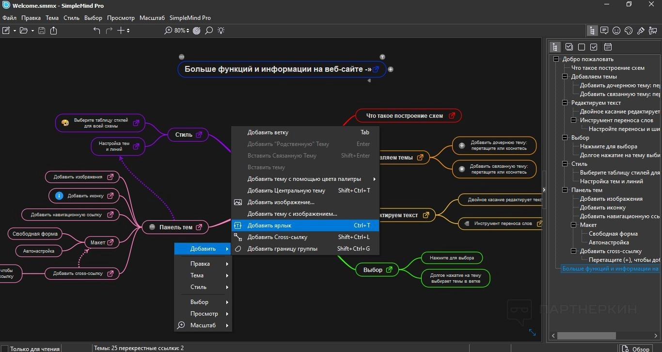 Основные инструменты для изменения темы также спрятаны в контекстном меню. Чтобы получить к ним доступ, выберите ветку и кликните по ней правой кнопкой мыши. Здесь дублируются все команды, представленные в верхней навигации софта.