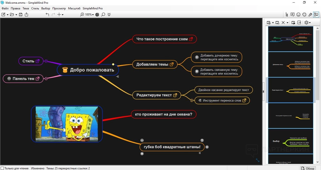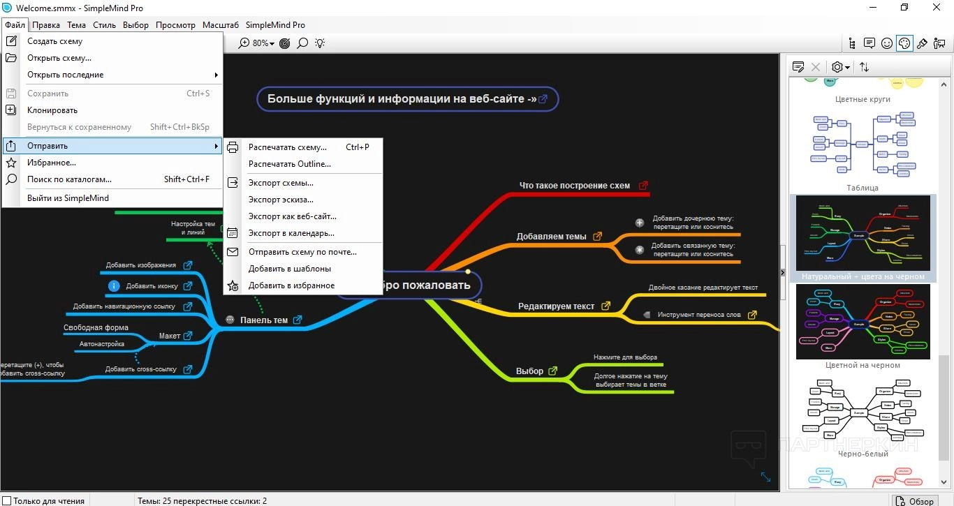Сразу после установки и запуска программа запускает готовый шаблон, с которого можно быстро стартовать. Изменять темы и работать с картой можно несколькими способами: при помощи команд из основного меню, правой кнопкой мыши и горячими клавишами.