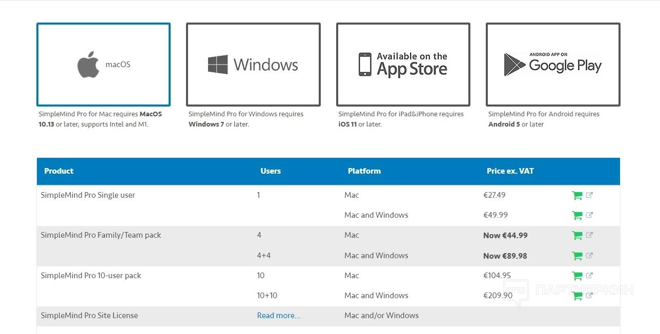 - SimpleMind Pro Single user – 1 пользователь; Windows или Windows – €27.49; Windows + Mac – €49.99;