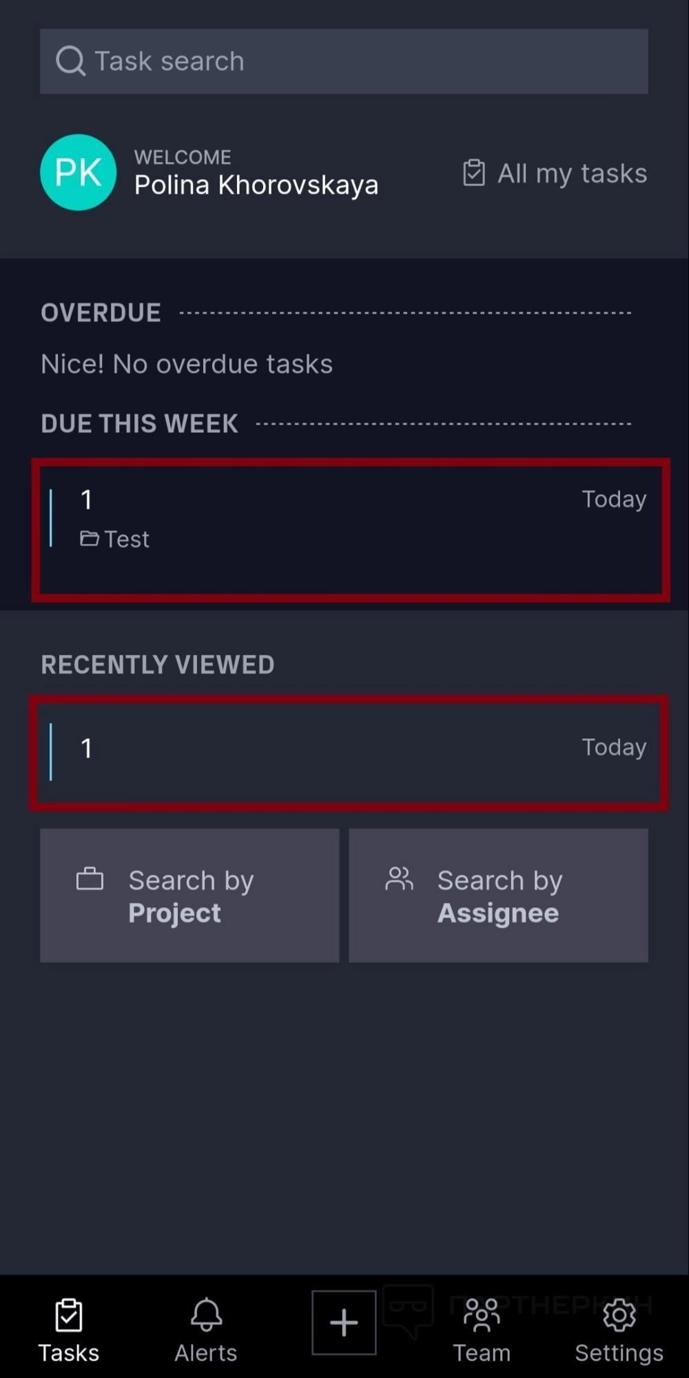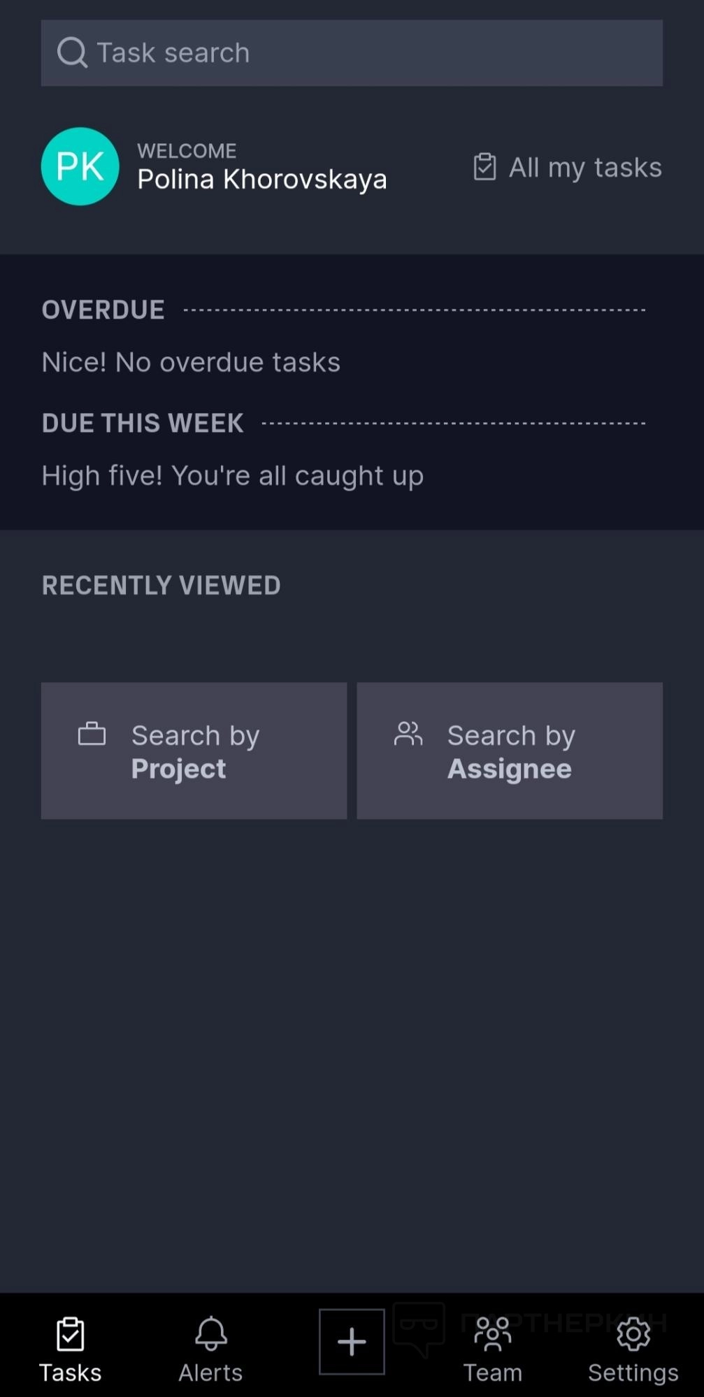 Сразу видим, что оформление сервис в мобильном приложении немного отличается от его веб-версии: основная рабочая панель находится в нижней части страницы, а главный экран представляет собой список задач, которые должен выполнить конкретный пользователь (в данном случае сам владелец аккаунта).
