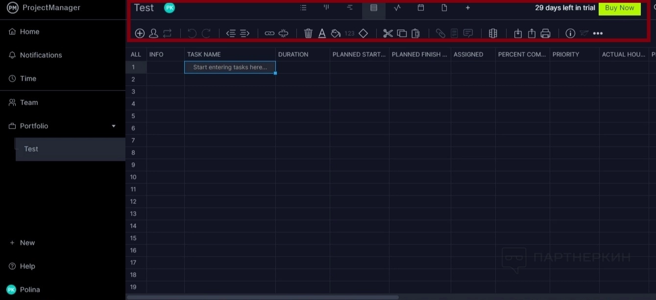 Здесь находятся как базовые инструменты для работы со стилем шрифта, размером, заливки цветом, кнопки копирования, отмены изменений и так далее. К специальным кнопкам относятся переключатели между форматами представления созданных задач (список задач, диаграммы Ганта и так далее), а также кнопки добавления файлов и календарь.