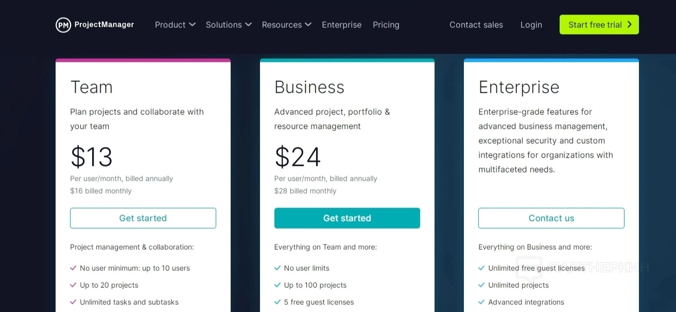 - предприятие — самый большой тариф с расширенными функциями. У него нет ограничений по количеству проектов и пользователей, однако для его подключения необходимо связываться с отделом продаж сервиса, так как стоимость рассчитывается индивидуально для каждой компании.