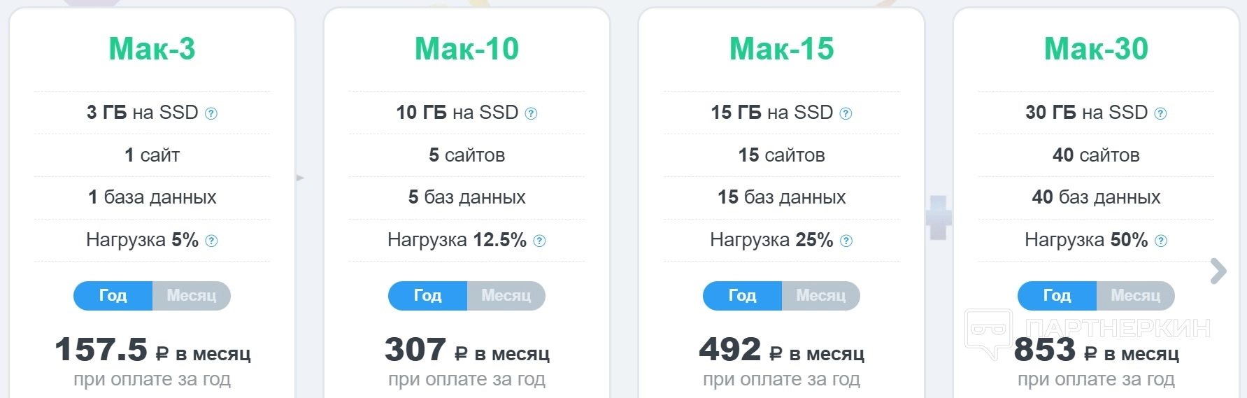 - CMS-хостинг. Позволяет размещать 25 сайтов, 25 баз данных, нагрузка 50%, 30 Гб на SSD. Услуга стоит 615 руб. в месяц.