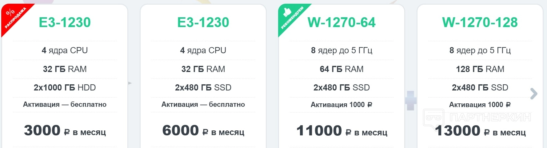 - Выделенный сервер. Услуга представлена широкой линейкой тарифных планов. Аренда сервера на базовом тарифе 4 ядра CPU, 32 Гб RAM, 2x1000 Гб HDD стоит от 3 000 руб. в месяц. Возможности самого дорогого тарифа: 32 ядра CPU, 256 Гб RAM, 2x480 Гб SSD, стоимость 30 000 руб. в месяц. На некоторых тарифах установка и активация платная — 1 000 руб.