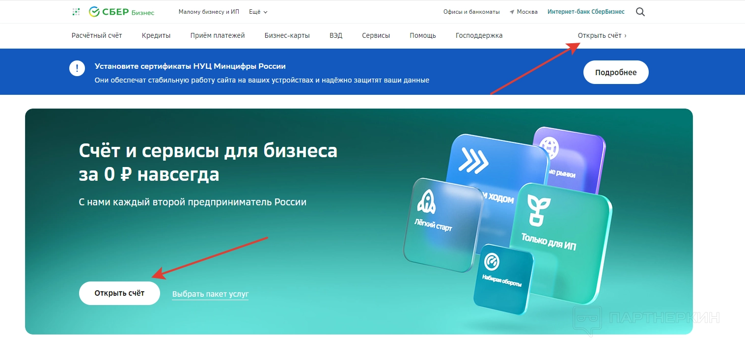Для начала юзер должен создать счет, после чего откроется пакет услуг в соответствии с выбранным тарифом. Для этого заходим на сайт и кликаем на «Открыть счет» в правом верхнем углу.