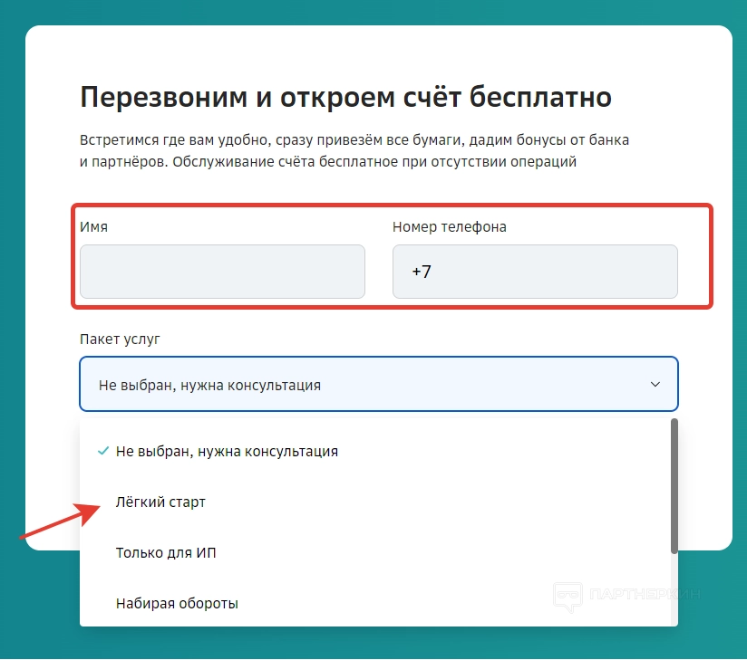 Далее откроется форма для ввода данных: имя, номер телефона и пакет услуг. Если пользователь хочет протестировать функционал на бесплатной основе, тогда лучше выбрать «Легкий старт».