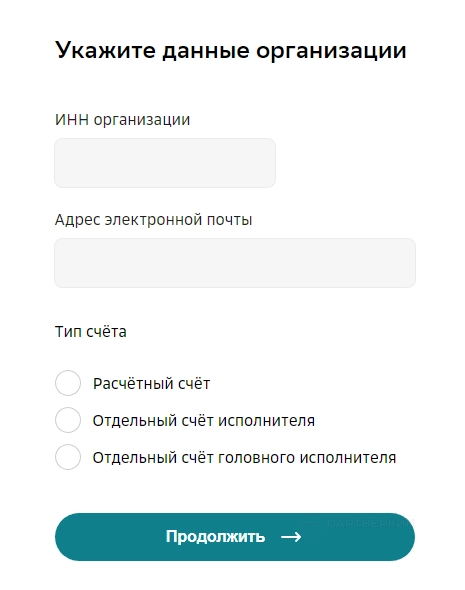 На следующем этапе указываем ИНН организации, адрес электронной почты и тип счета: расчетный, отдельный для исполнителя или отдельный для головного исполнителя. В конце вводим реквизиты своего счета и получаем зарезервированные реквизиты для работы с документацией.