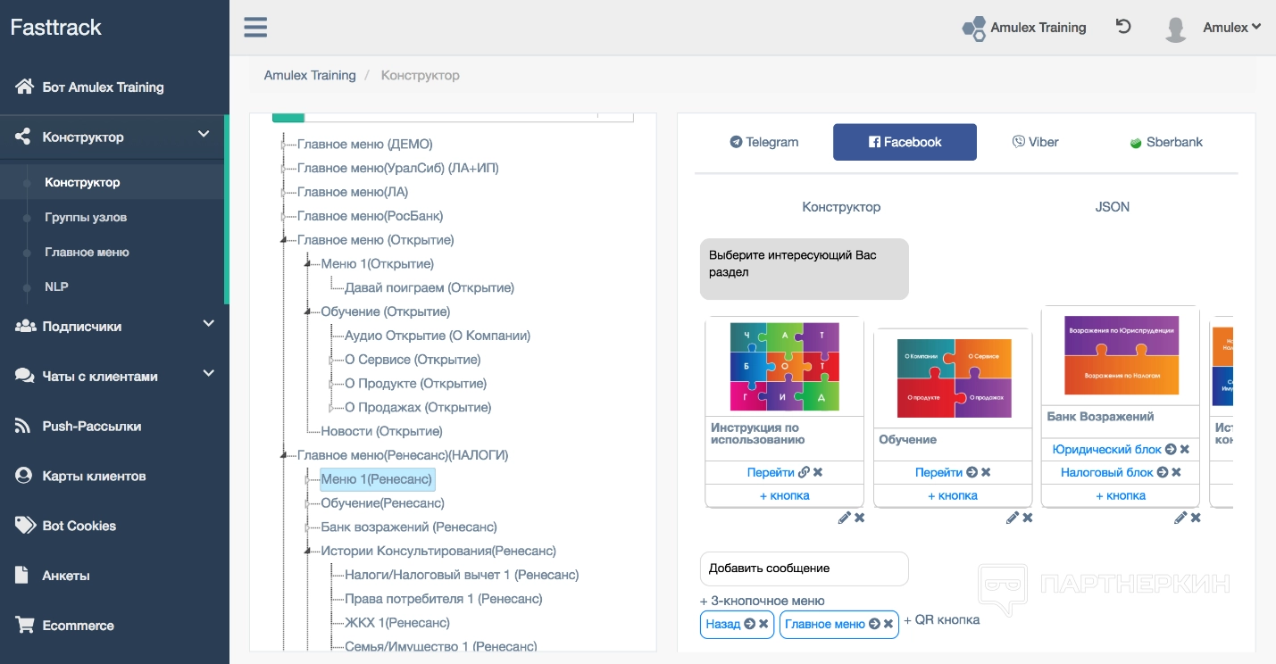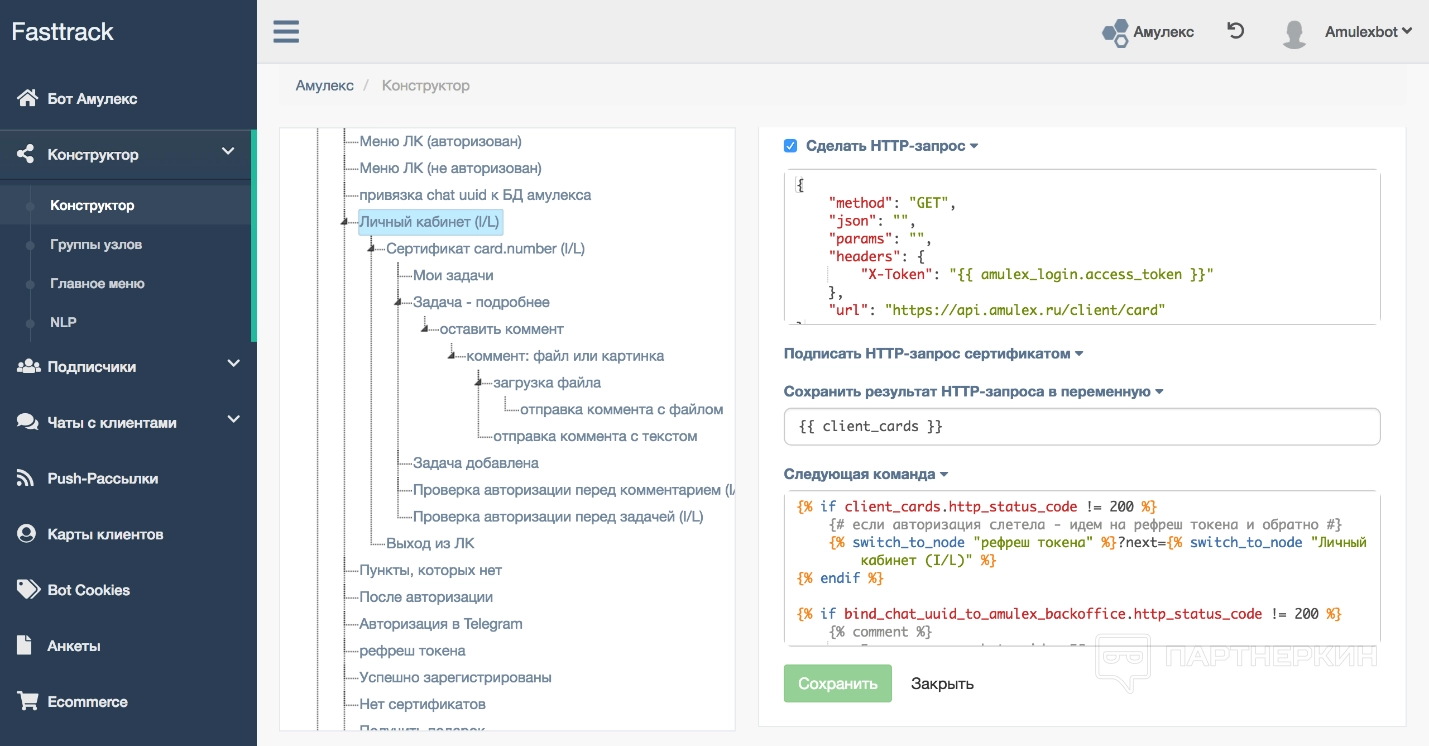 - Конструктор чат-ботов — единая логика на всех каналах, визуальный редактор под каждый мессенджер, процедуры и преобразования данных, режим для отладки и тестирования, а также шаблонизация динамического контента;