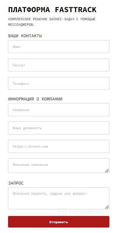 Нажав на соответствующую кнопку отправки заявки, пользователь увидеть сразу несколько форм: информация о себе (имя, актуальная почта и номер телефона), информация о бизнесе (название компании, должность заявителя, сайт и краткое описание деятельности), а также запрос (что именно должен сделать чат-бот, и какие есть идеи по реализации). Последний пункт можно описать и без идей — в ближайшее позвонит менеджер, который предложит предварительное решение.