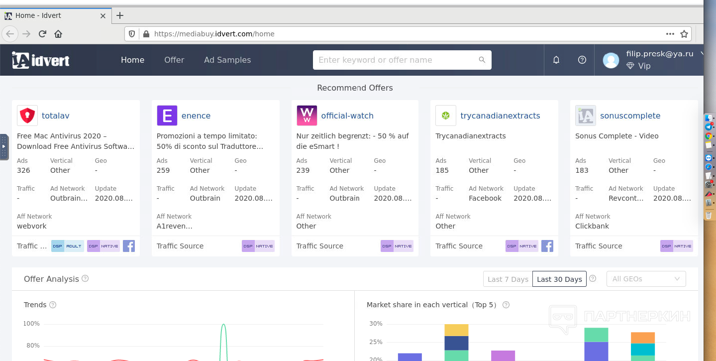 - Idvert_mediabuy. Это мощный буржуйский инструмент для подробной аналитики и поиска лучших офферов и трафика, с возможностью скачать лендинг в один клик.