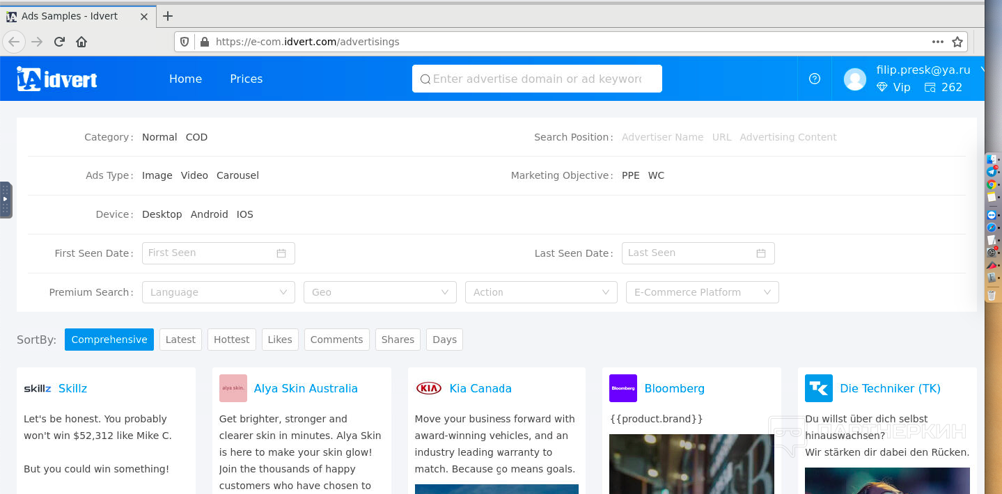 - Idvert_ecommerce. Здесь доступна база лучших креативов, охватывающая все популярные форматы, с анализом эффективности по ГЕО, устройствам, и аудиториям.