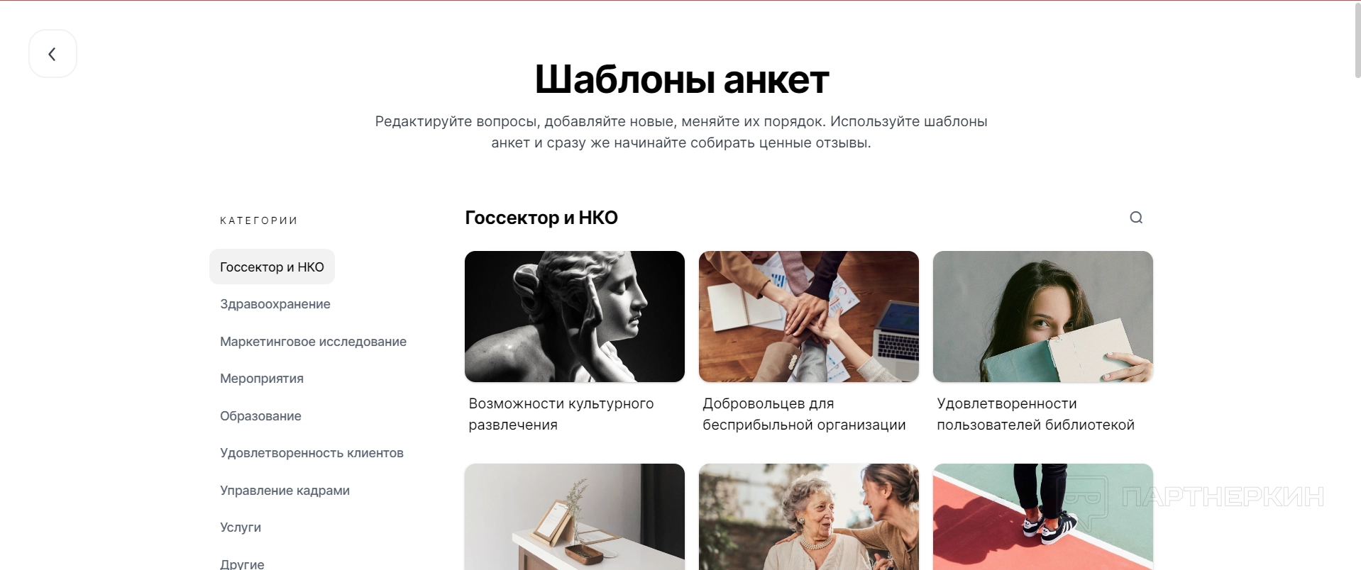 Чтобы работать с сервисом, необходимо сначала пройти быструю регистрацию и заполнить данные о компании. Сразу после пользователь попадает в рабочее пространство, где ему предлагают либо выбрать готовый шаблон для основы опроса, либо начать работу с чистого листа.