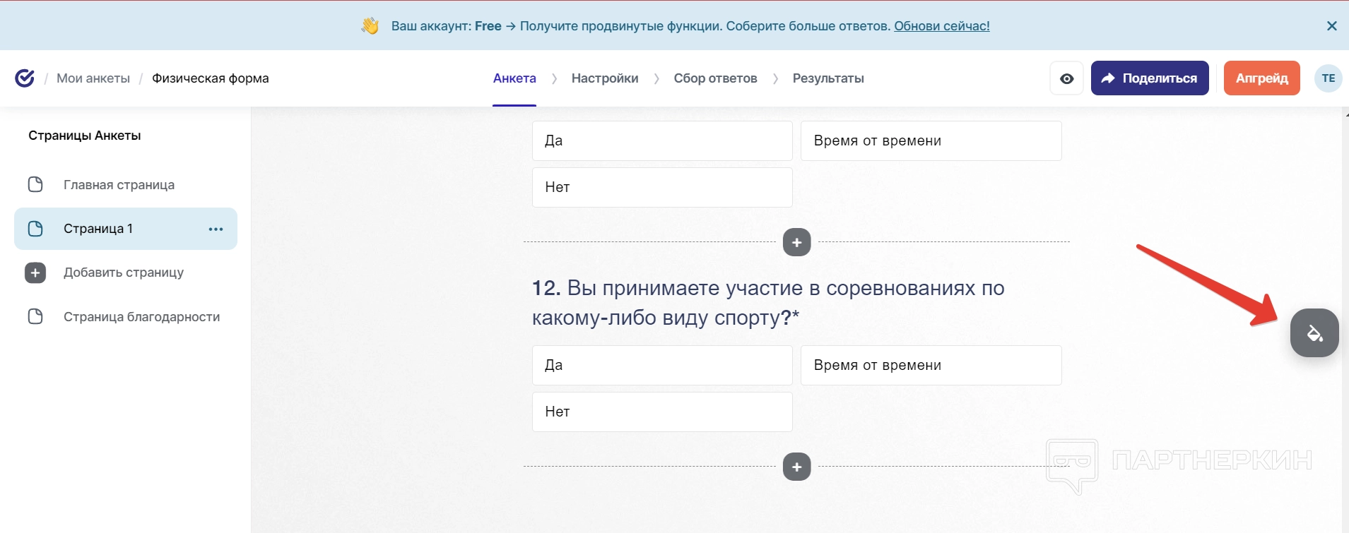 Если нужно настроить дизайн всех вопросов на странице, можно поменять основную тему. Для этого нужно нажать на значок заливки с правой стороны экрана и выбрать нужный вариант расцветки.
