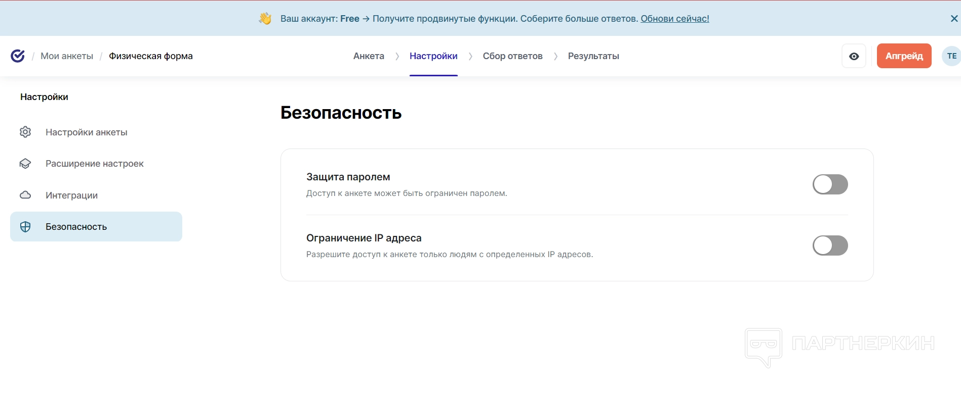 В пункте с безопасностью можно настроить доступ к анкете через пароль или с определенного IP-адреса.