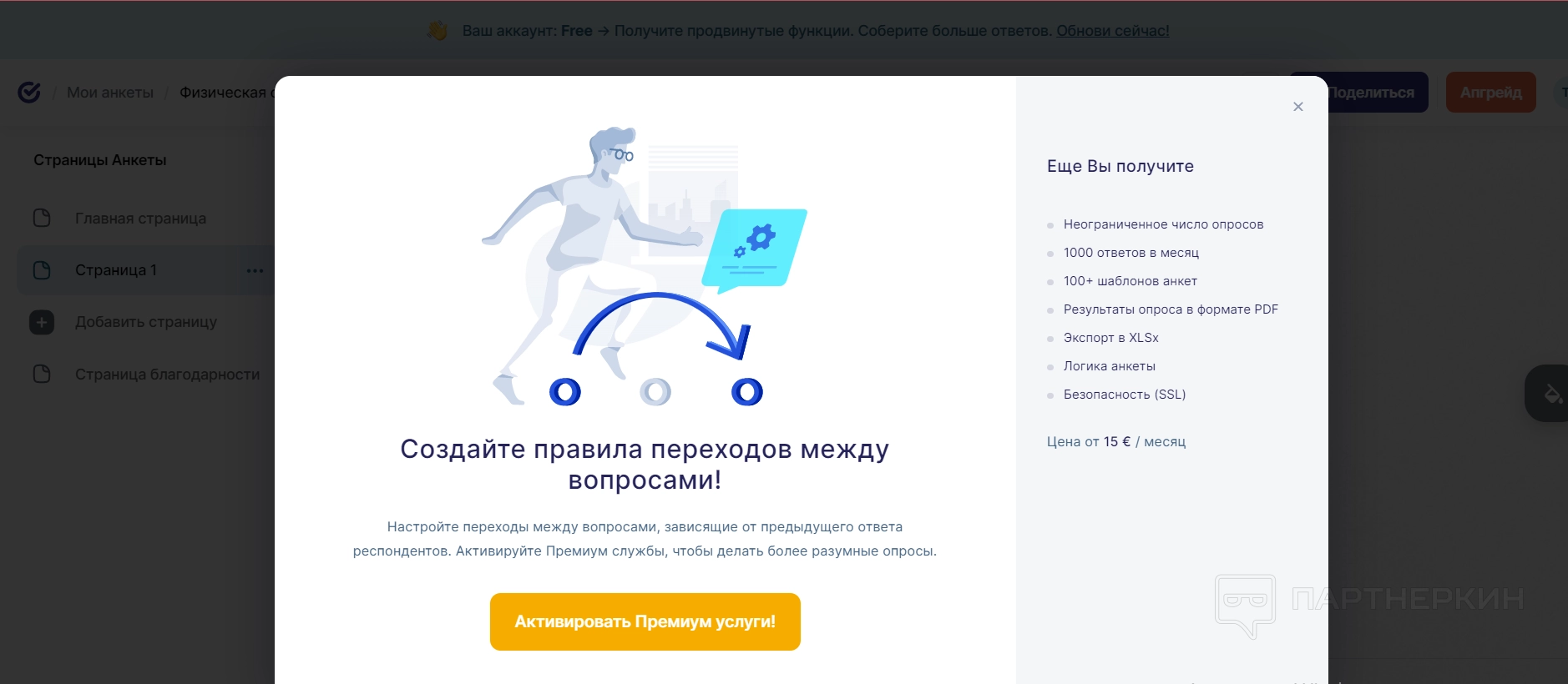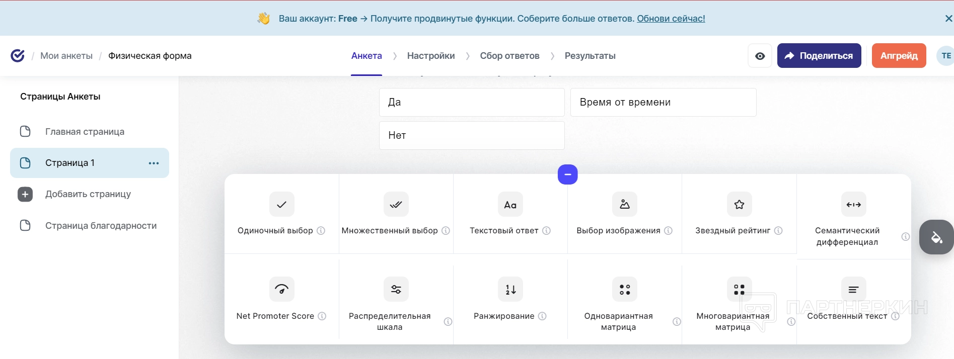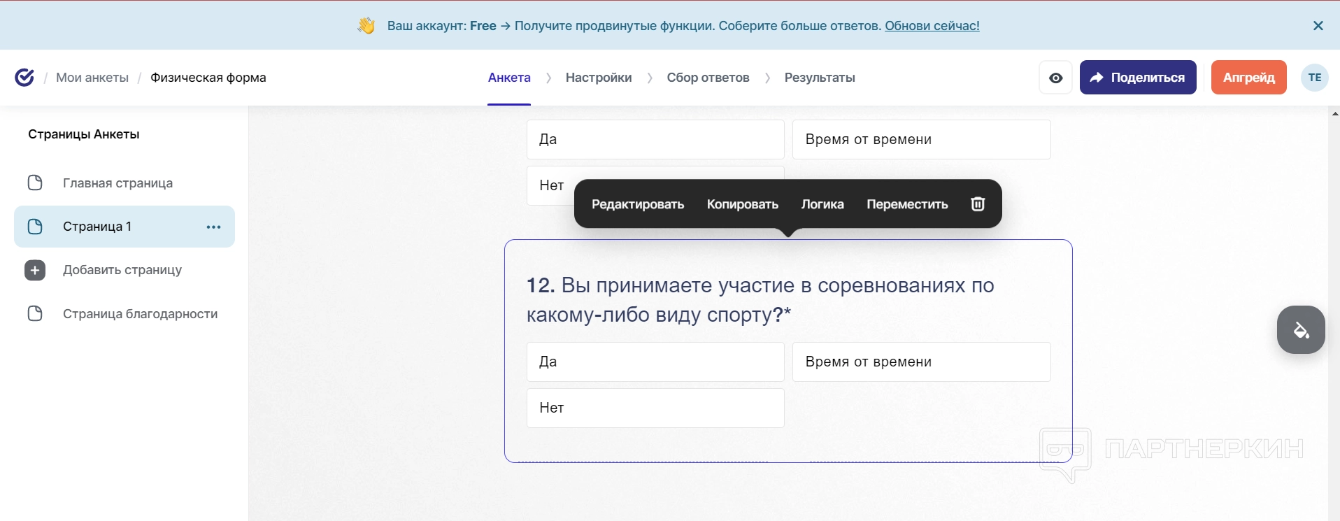 После настройки самого вопроса можно перейти к настройке его логики — с помощью этой функции пользователи могут задать правила, по которым пользователи будут переходить от одного вопроса к другому. Например, при одном варианте ответа он попадет к одному вопросу, а при другом ответе перед ним откроется противоположный вообще вопрос. Логика помогает разделять целевые вопросы между смешанной аудиторией, что очень полезно для крупных компаний с различными отделами или просто для опросов, которые проводятся для определенных исследований. Но данная функция премиальная — доступ к ней появляется после подписки.