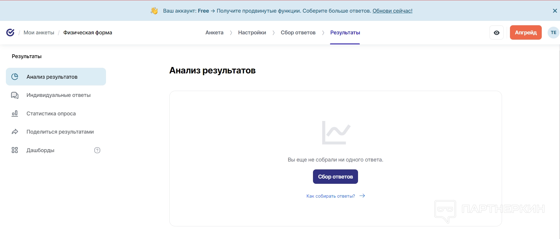 Результаты — тут будут отображаться все результаты данного опроса, а также их аналитика. При этом результатами можно поделиться по необходимости или на их основе создать дашборд для резюмирования.