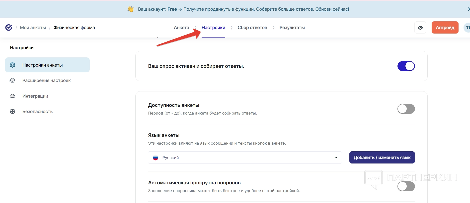 Настройки опроса — здесь можно активировать или дезактивировать опрос, а также установить период доступности анкеты, ее язык по умолчанию, автоматическую прокрутку, возвращение к предыдущим вопросам, а также расположение серверов для сохранения ответов.