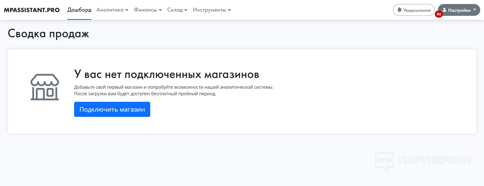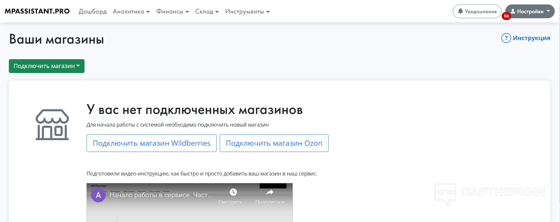 После этого пользователь попадает в личный кабинет, где ему нужно добавить свой магазин и подключить аккаунты на маркетплейсах, чтобы начать управлять ими.