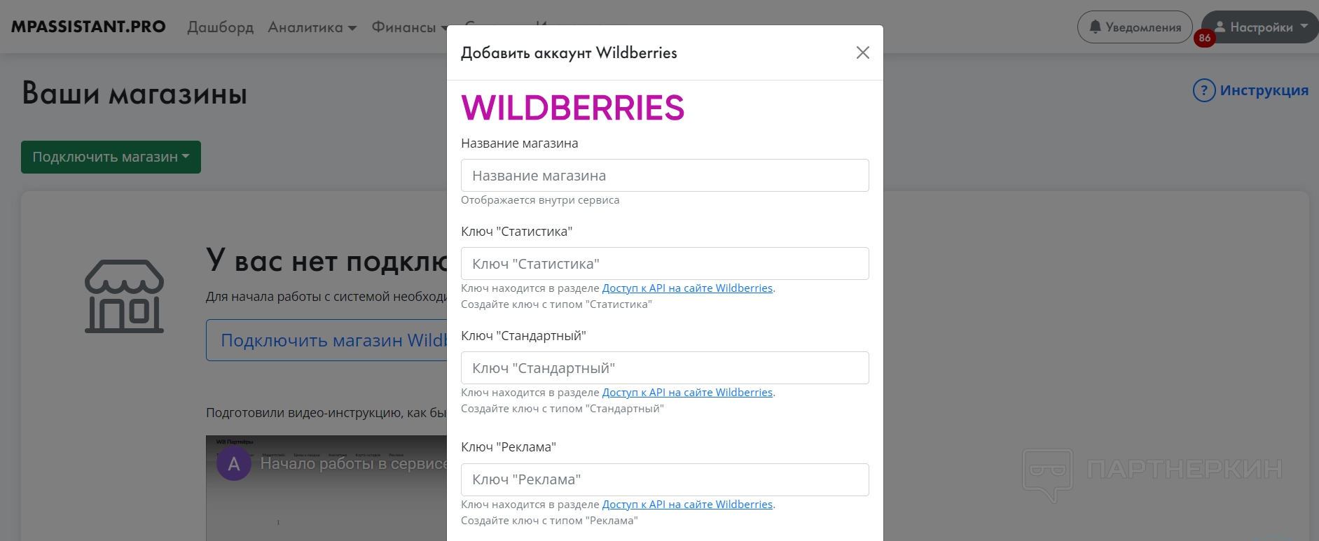 В процессе подключения нужно выбрать платформу, где находится интернет-магазин — Wildberries или Ozon.