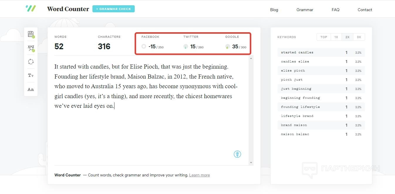 Если текст недостаточно длинный, чтобы подпасть под определение статьи, сервис будет рассматривать его как контент для социальных сетей. В этом случае в верхней части центрального окна показываются подсказки относительно оптимального объема для Facebook*, Twitter, Google. Если проверяемый текст окажется слишком коротким, возле этих пунктов будет указано, какое количество слов нужно добавить или удалить.