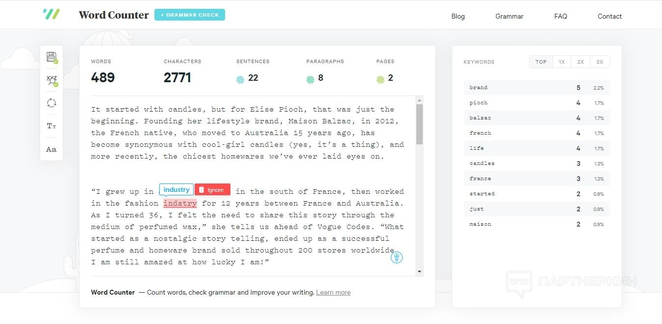Инструмент также позволяет отследить наиболее часто используемые в статье слова, что позволяет снизить заспамленность текста. Помимо этого, сервис использует технологии сайта Perfect tense для автоматической проверки на наличие ошибок.