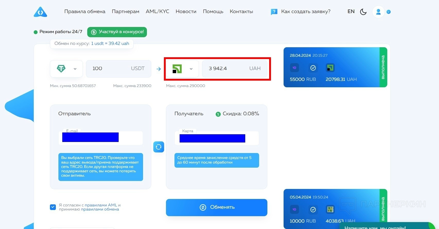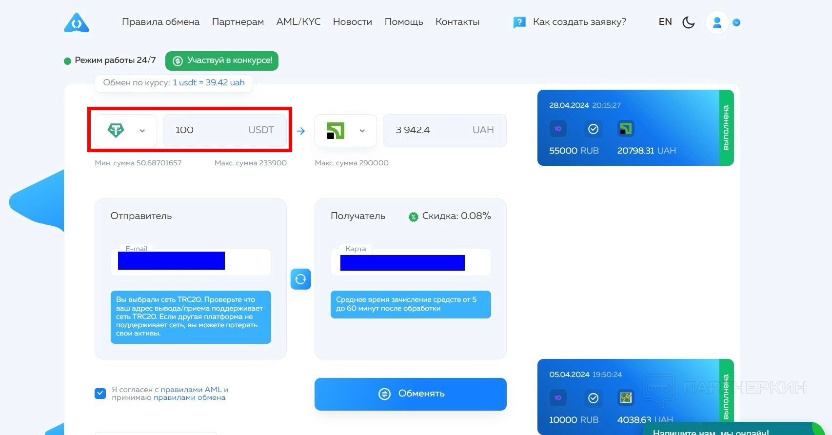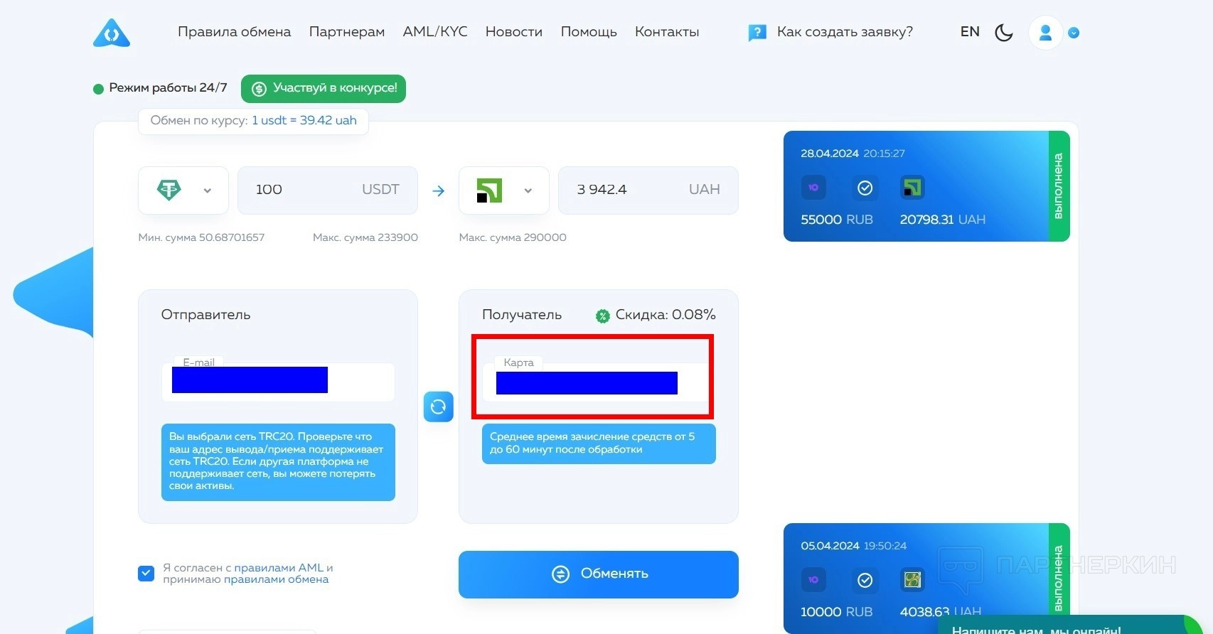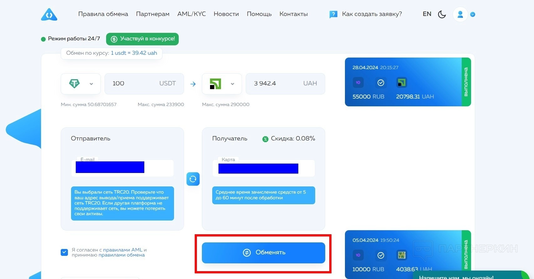 Заявки обрабатываются в автоматическом режиме в течение 5 минут и 1 часа после оплаты счета. В случае обнаружения серьезного AML-риска сделка переходит на ручной режим обработки, что обеспечивает дополнительный уровень безопасности.