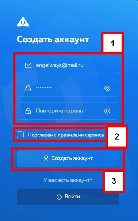 - Выберите в появившемся окне название e-mail и введите пароль (1). Для начала необходимо согласиться с правилами сервиса (2) и нажать на кнопку «Создать аккаунт» (3).