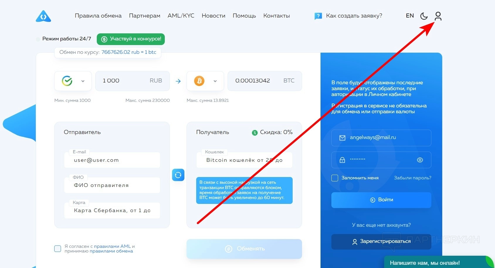 На сайте доступна продажа и покупка криптовалюты без необходимости авторизации. Профиль автоматически сформируется в момент совершения первой сделки. При совершении последующих операций клиент получает накопительную скидку, а также доступ к партнерской программе.