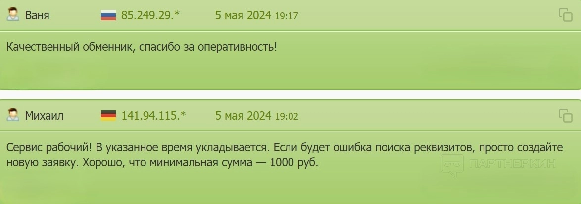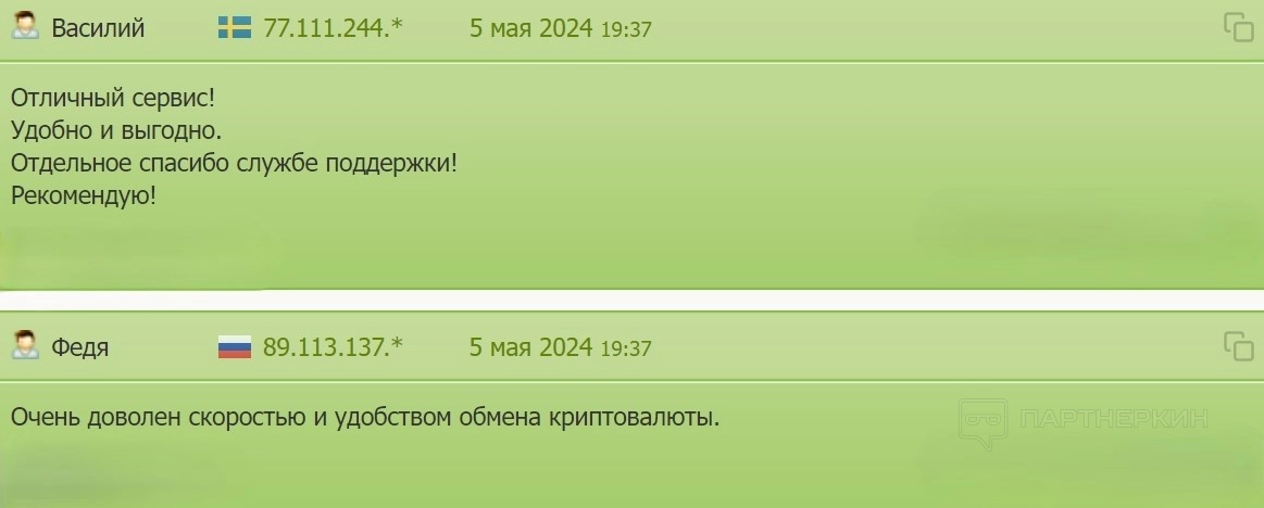 Положительные отзывы в основном связаны с удобством использования сервиса, выгодными курсами обмена, оперативной работой службы поддержки и быстрой скоростью обмена.