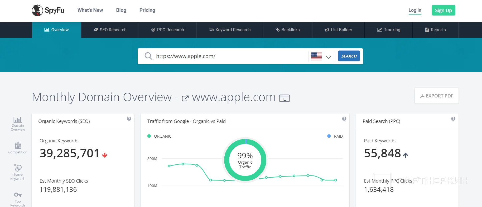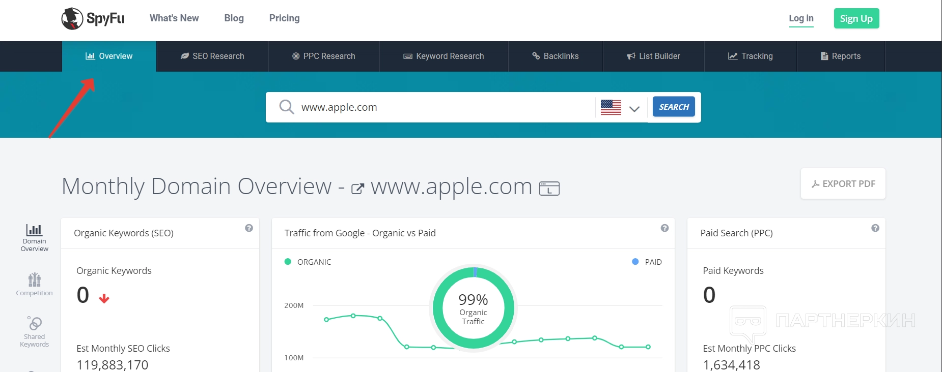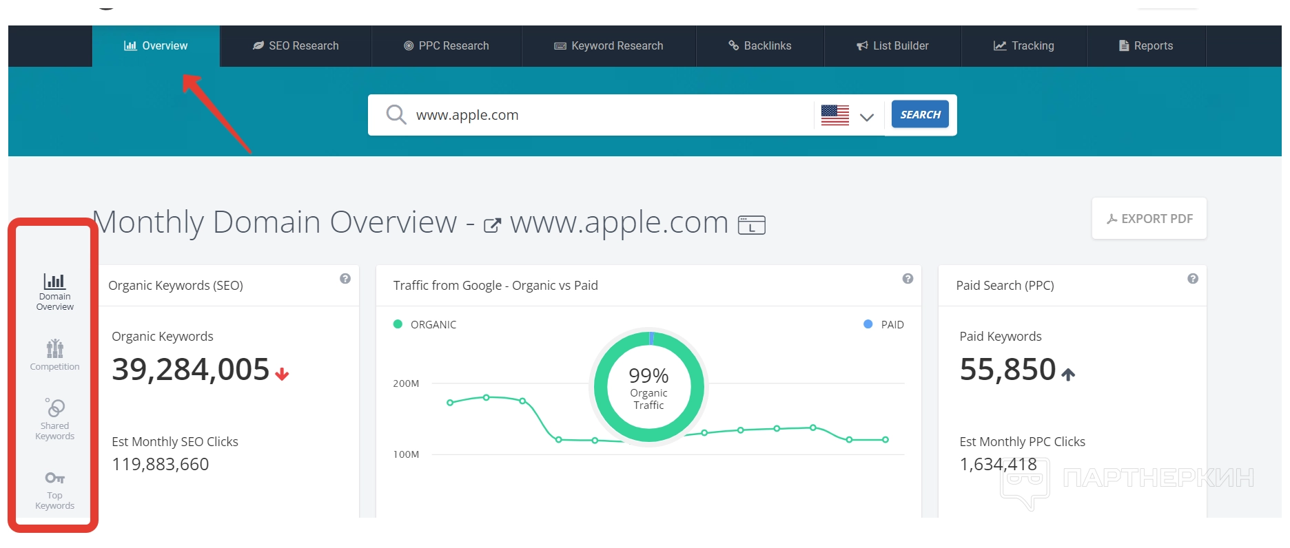 Обзор домена — это главный раздел, который открывается после запуска анализа. В нем собрали все основные данные о домене: ключевые слова, данные об органическом Google трафике, данные о проплаченном трафике, а также возможные затраты на рекламу. В этом же разделе предоставили те ключевые слова, которые работали лучше, и рекомендации по рекламе.