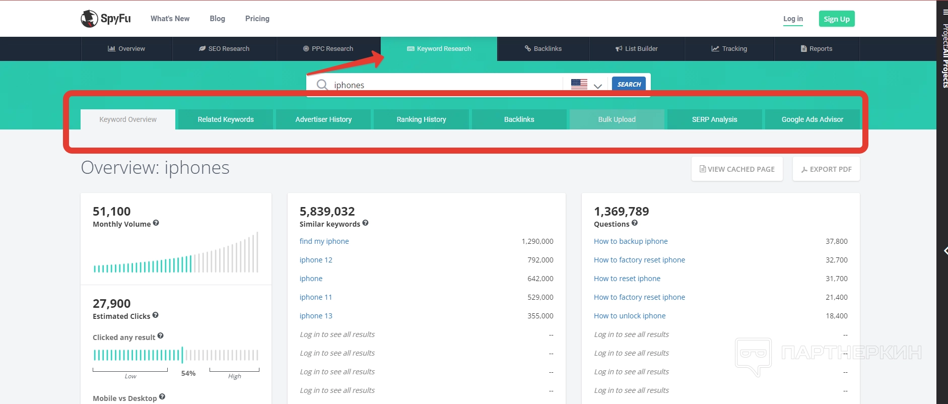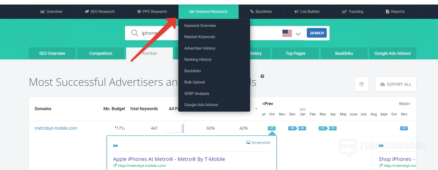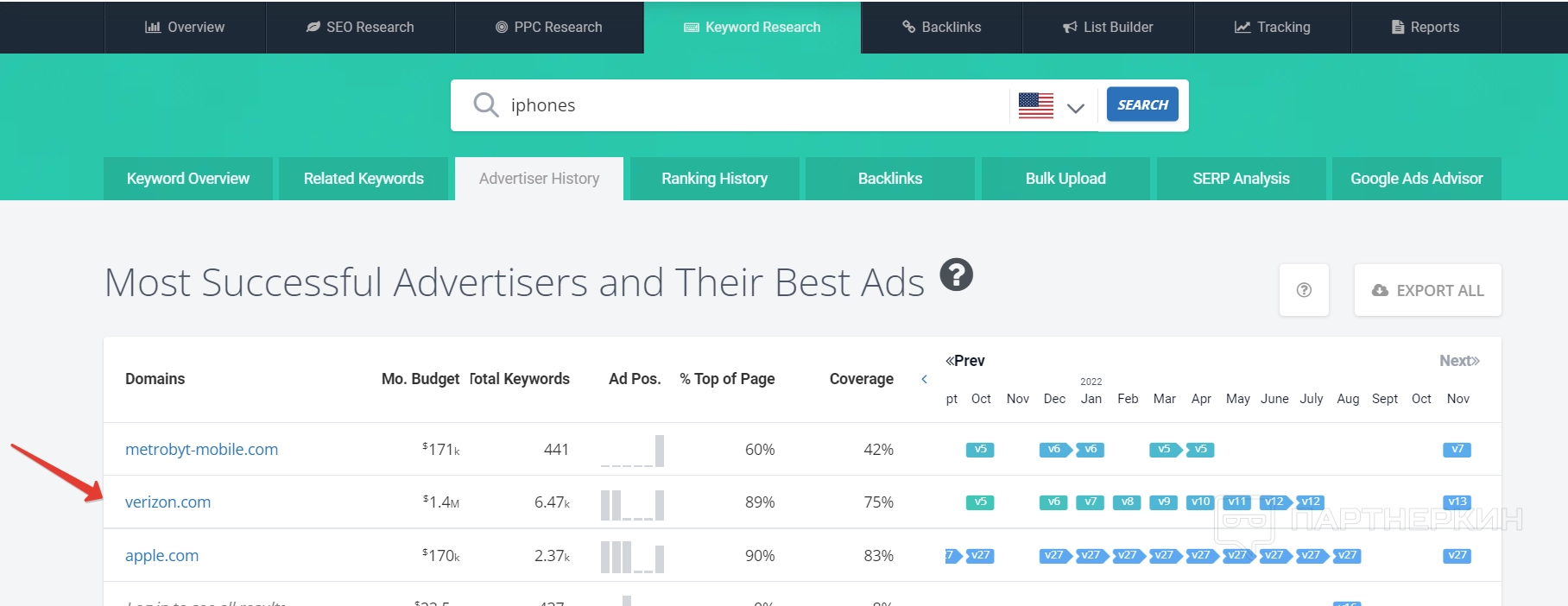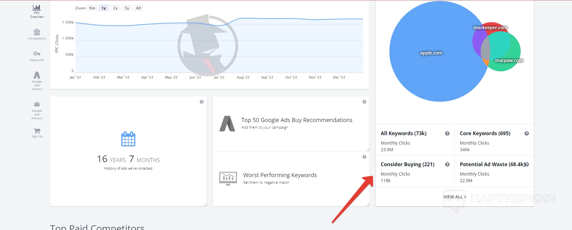 Исследование ключевых фраз — в этом разделе можно найти подробный анализ ключевиков сайта, сравнение рекламных кампаний, а также истории использования ключевиков. Например, в разделе представляют самые успешные объявления с ключевыми фразами, которые используются на сайте, — это дает понять, как составлять успешные объявления самому.