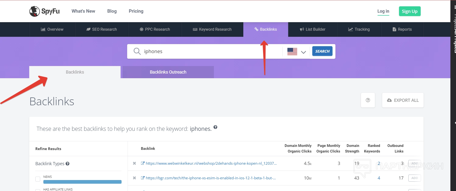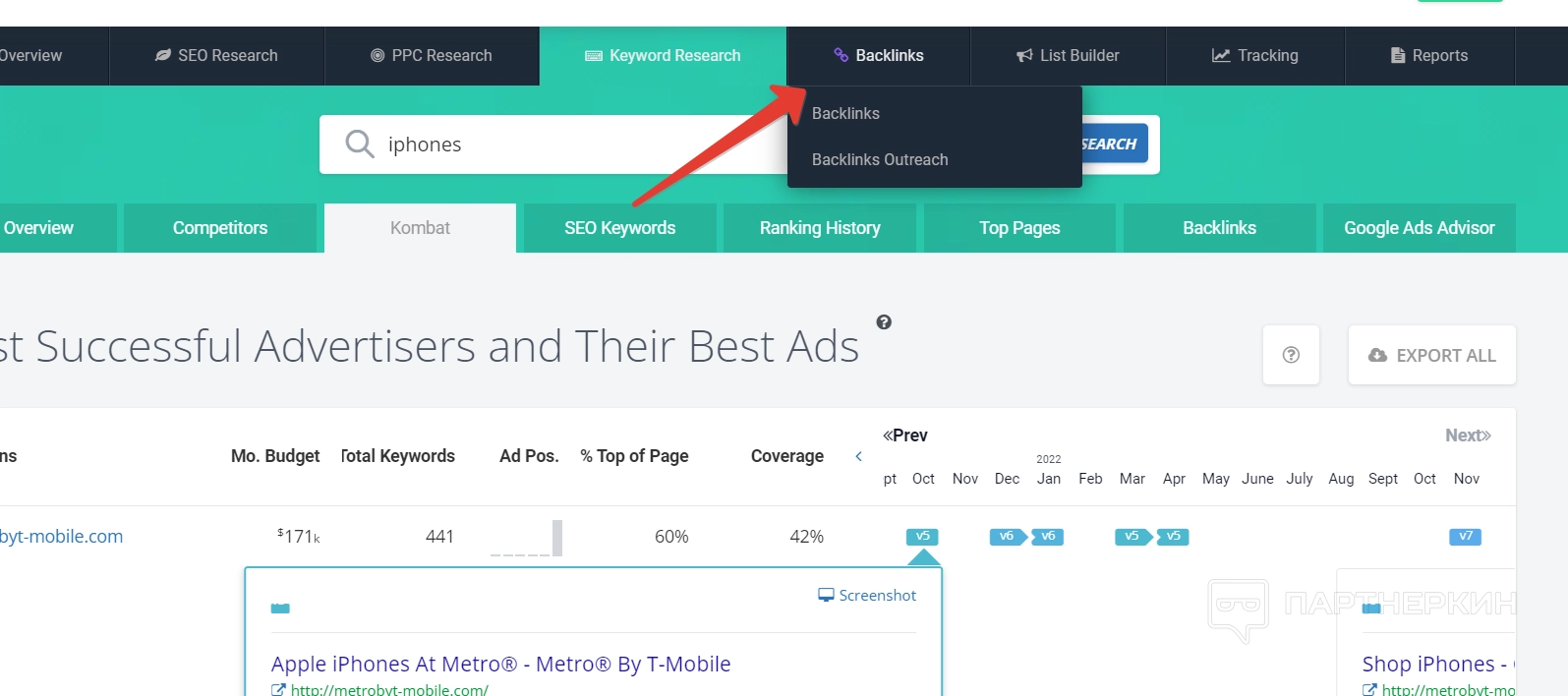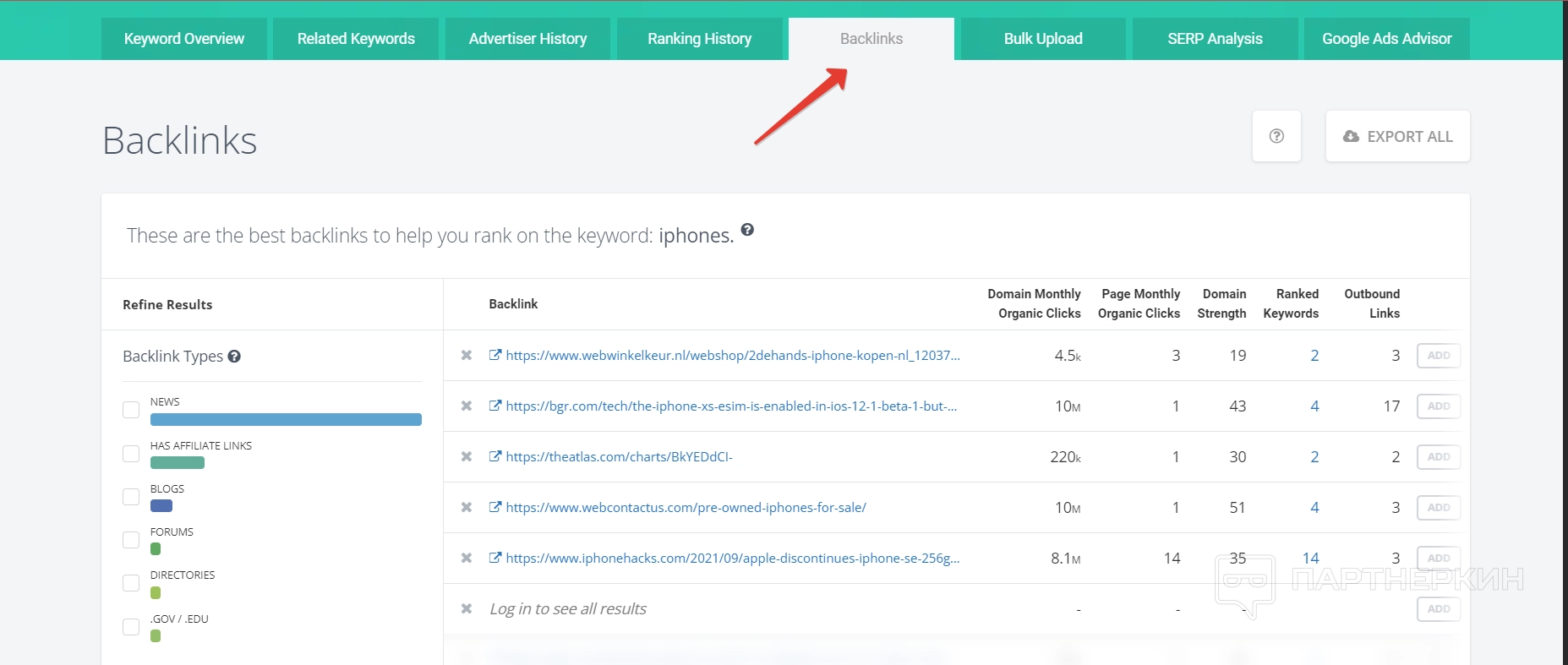 В разделе с обратными ссылками можно также получить данные по тем, которые помогут ранжироваться через определенное ключевое слово. Достаточно указать нужный ключ и получить список всех обратных ссылок и их типов.