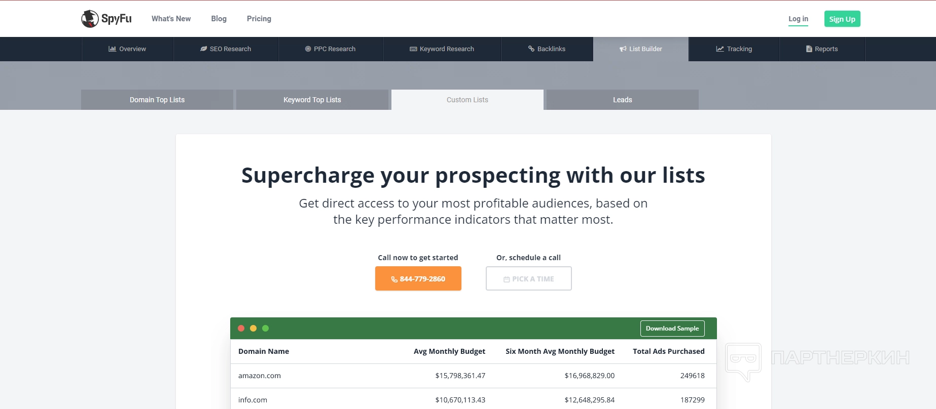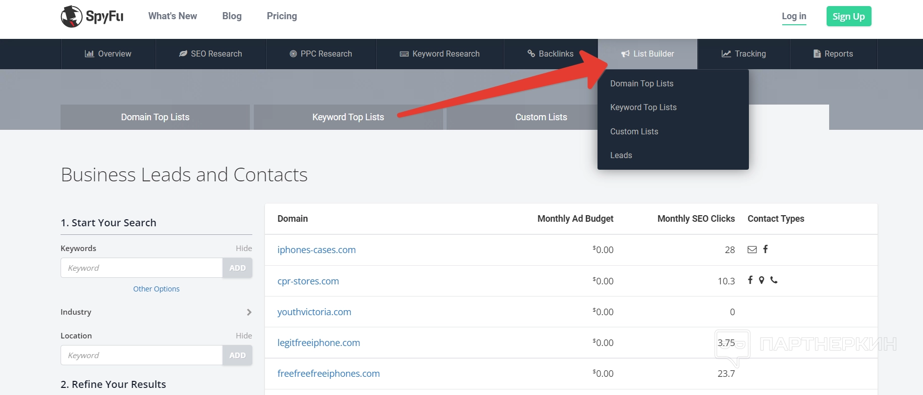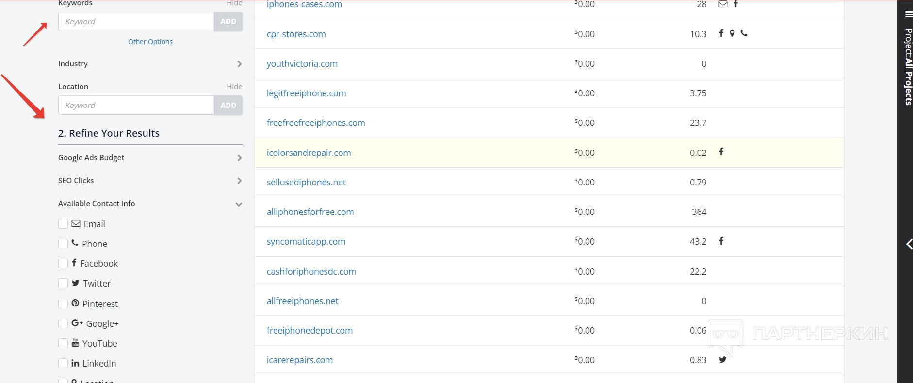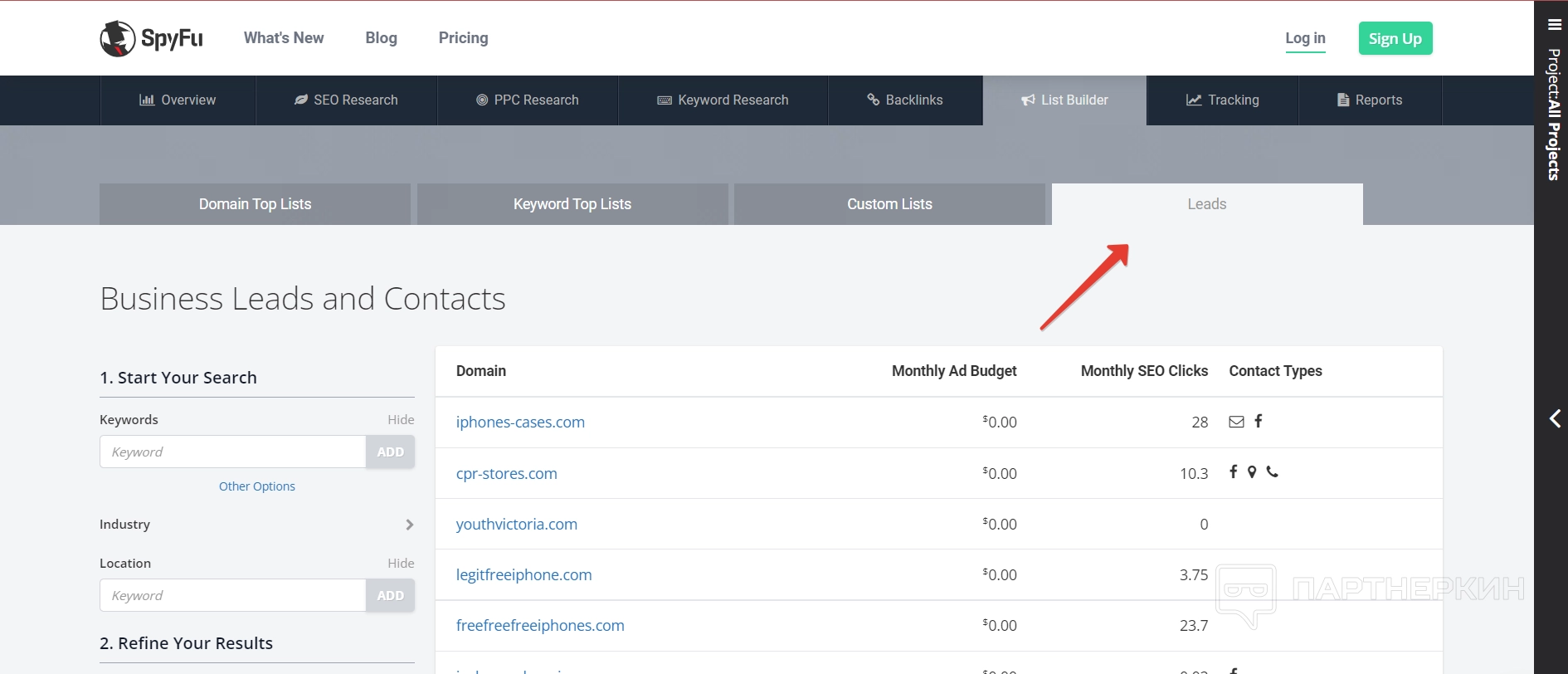 Бизнес-лидеры и контакты — в этом списке подбиваются все популярные в Сети компании, которые активно занимаются продвижением. Система выдает сам домен компании, ежемесячный бюджет, ежемесячные клики, а также способы связи — например, Фейсбук*, номер телефона или почту.