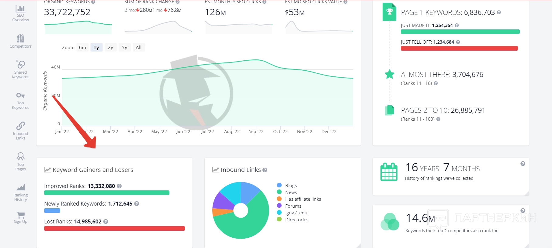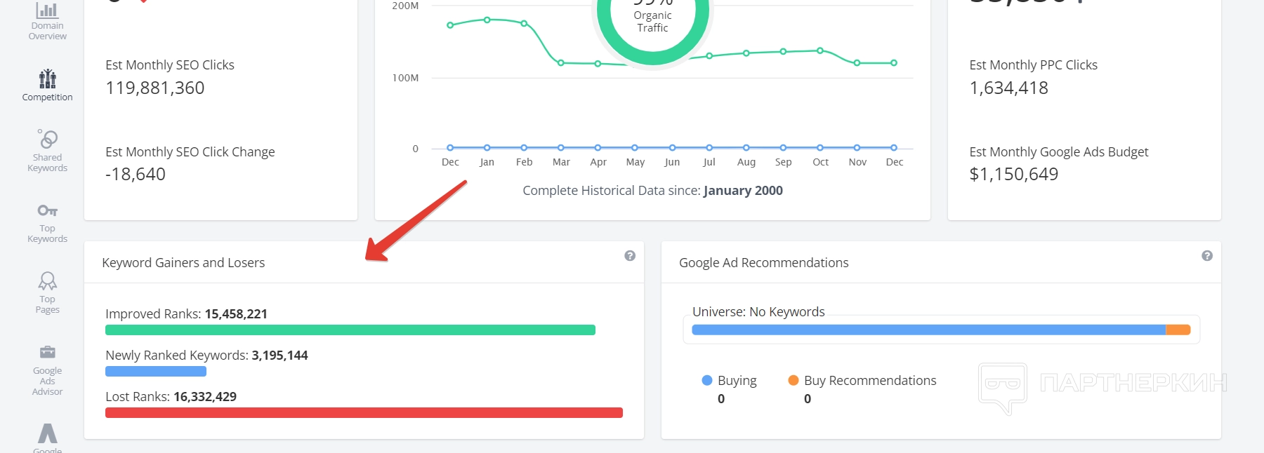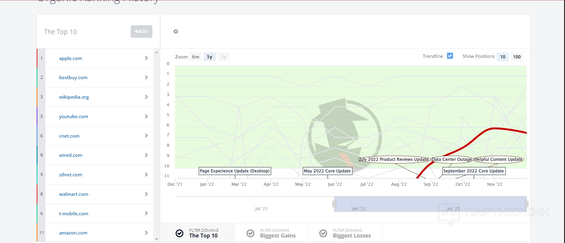 История органического рейтинга — здесь отображаются все конкуренты, которые использовали данный ключ, и их рейтинг в поисковике за последний год. Можно отслеживать, какие позиции занимал собственный домен в сравнении с конкурентами. При этом график можно изменить и просмотреть данные по самым большим прибылям, а также по самым большим потерям.