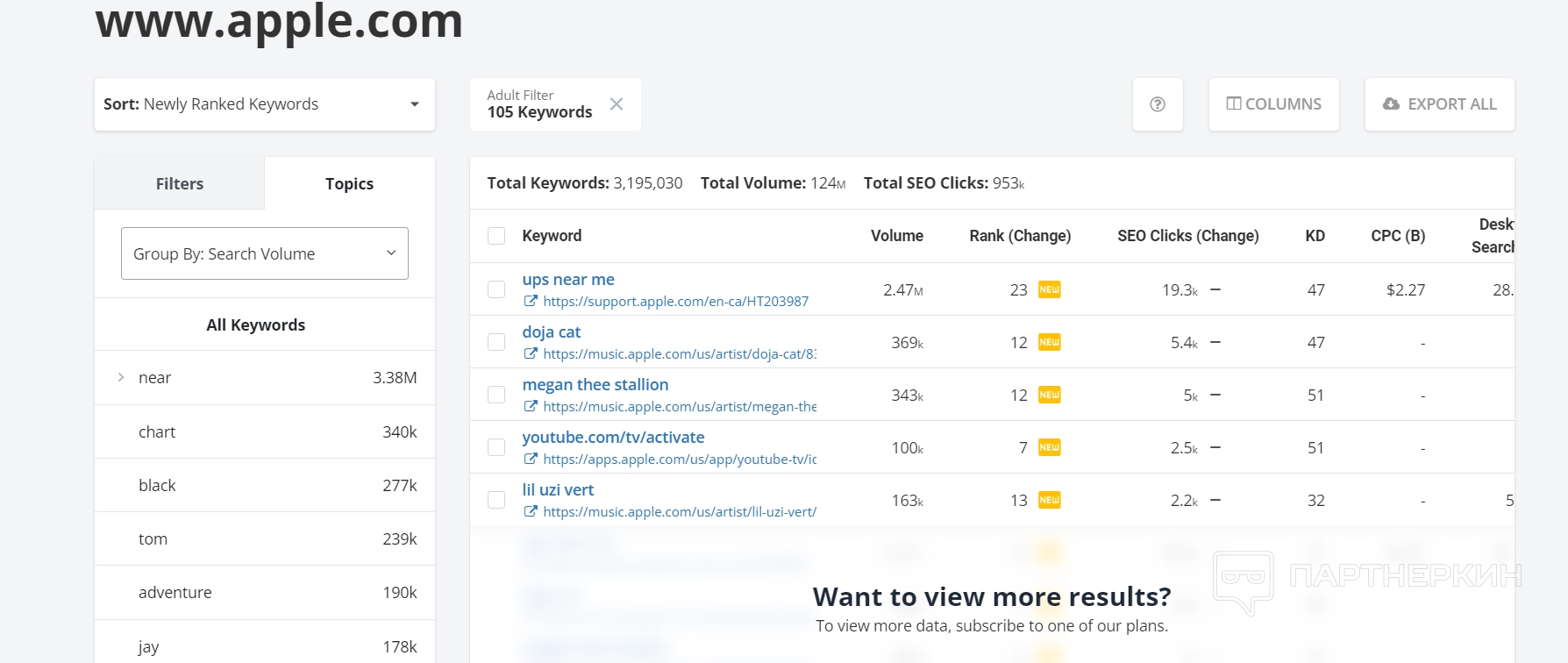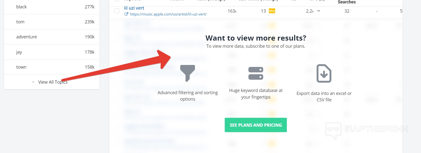 Но здесь важна одна деталь — данные в любом случае будут неполными. Система выдает лишь часть информации — чтобы узнать больше, придется проплачивать план. Например, при оплате плана можно проводить более удобную фильтрацию ключевых слов, использовать встроенную базу с ключевиками или экспортировать данные в формате таблицы — остальные возможности разберем ниже.
