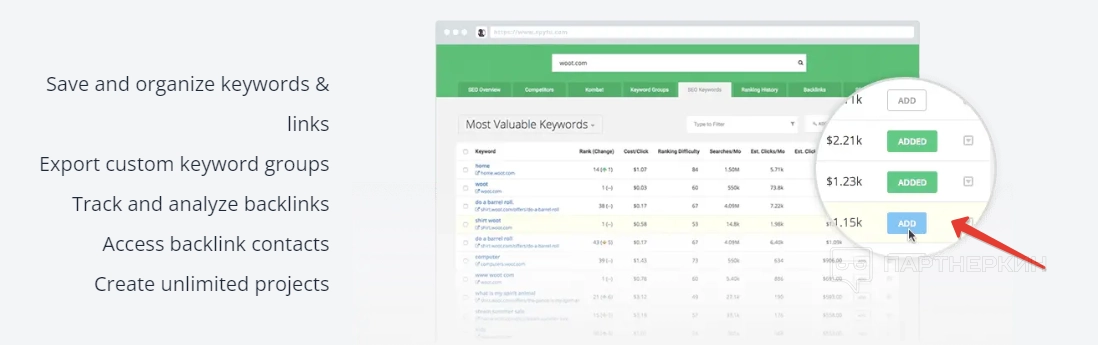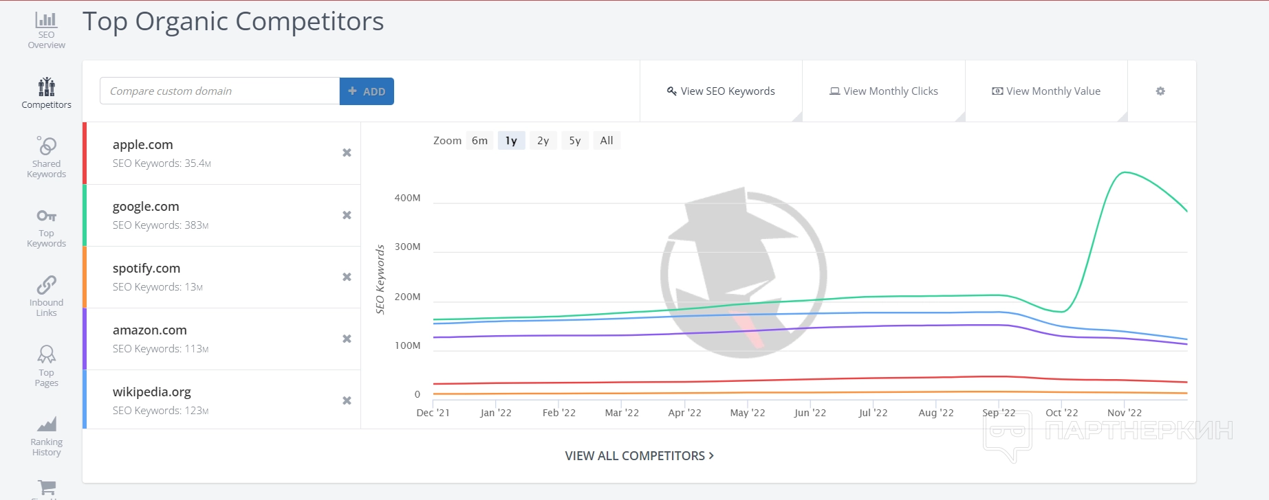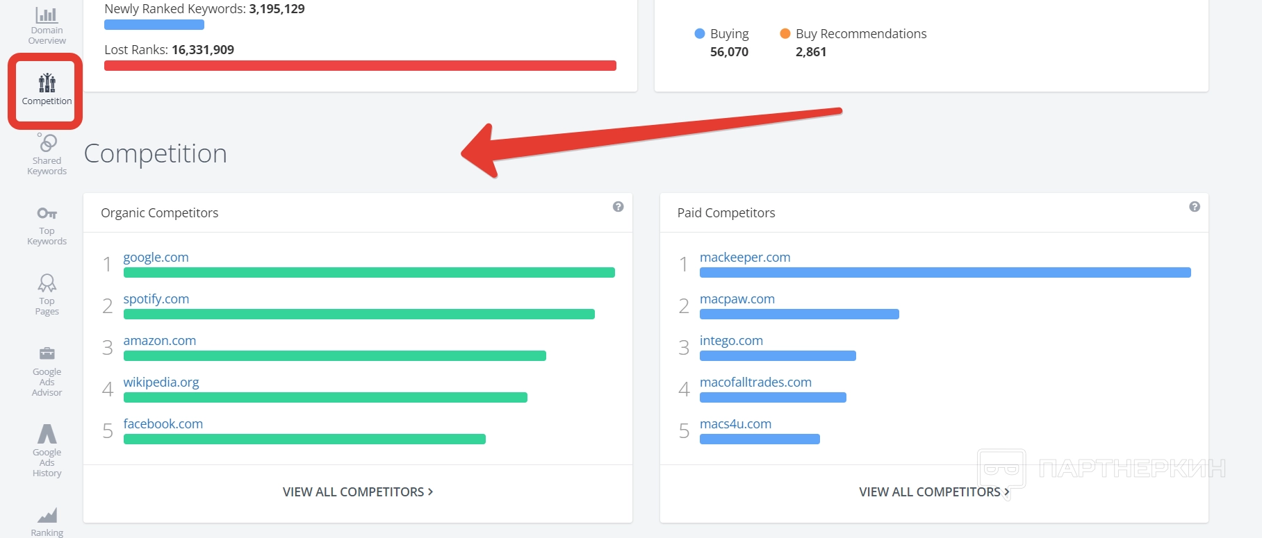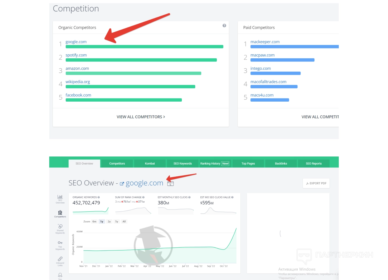 Конкуренты — в seo-разделе в пункте с конкурентами показываются органические конкуренты по ключевым словам, причем можно просмотреть, какие именно ключевые фразы используют они. Также показывается их объем ежемесячных кликов и их стоимость за месяц. Эти данные могут дать отличную информацию о действиях конкурентов.