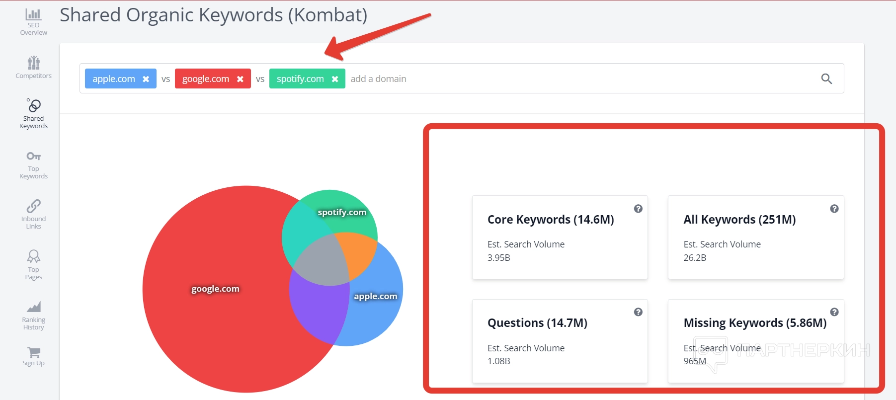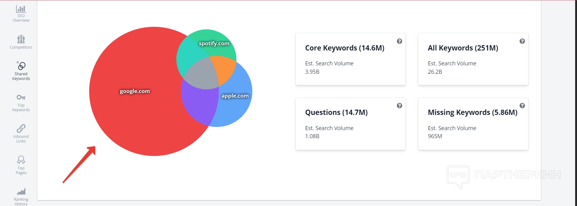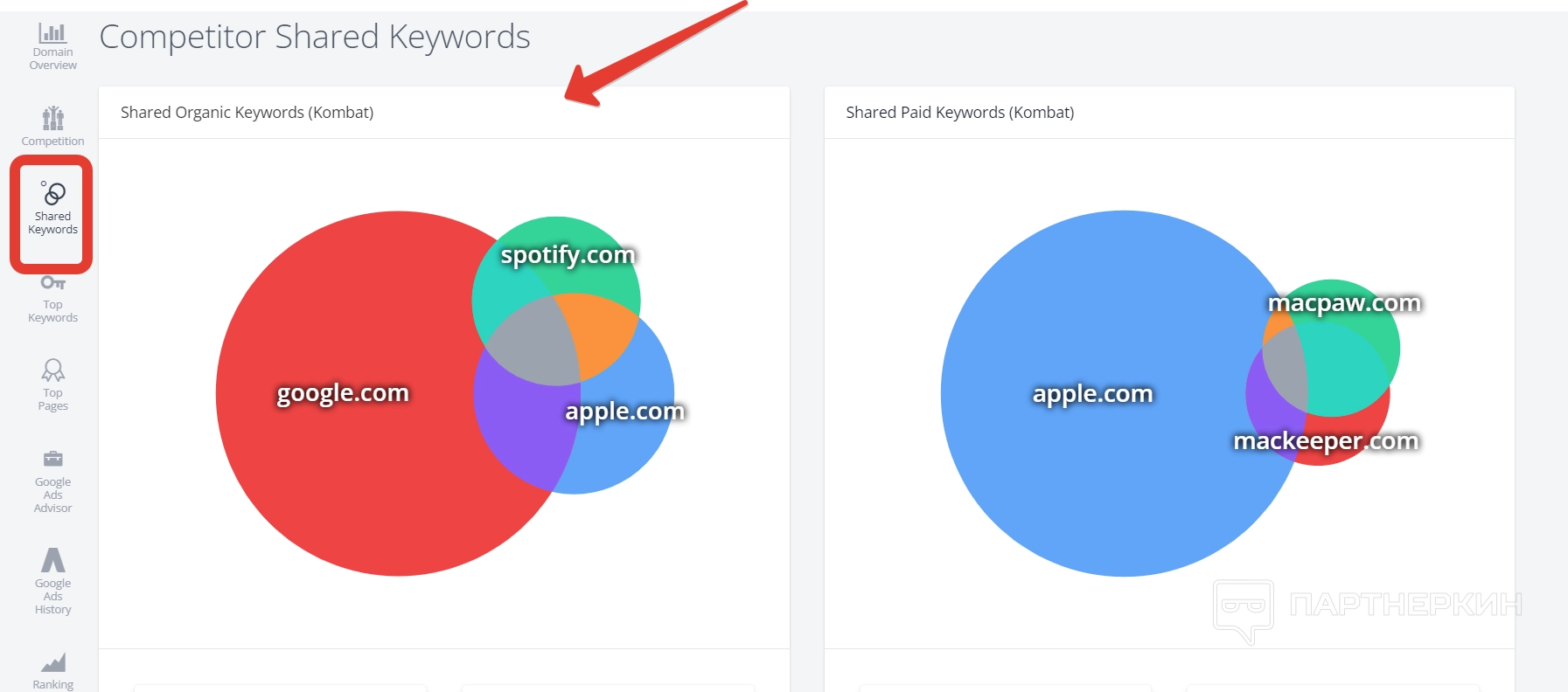 Общие органические слова — в этом пункте можно посмотреть, какие органические ключевые слова конкурентов совпадают с собственными. Данные представлены в виде удобного графика.