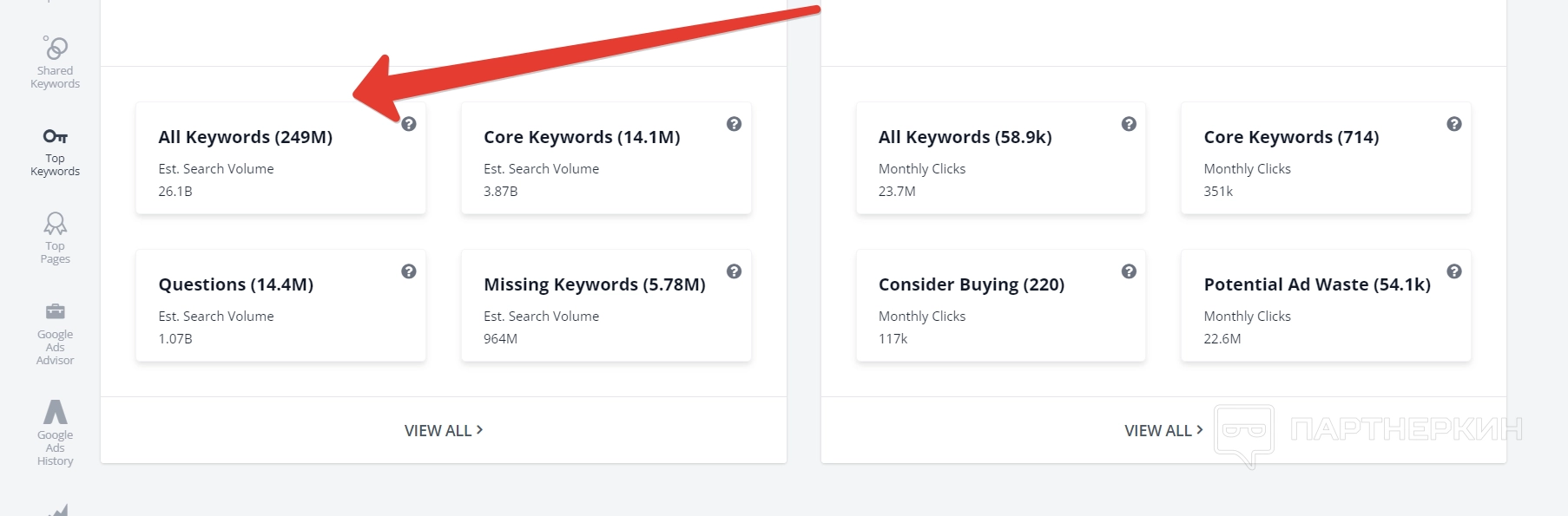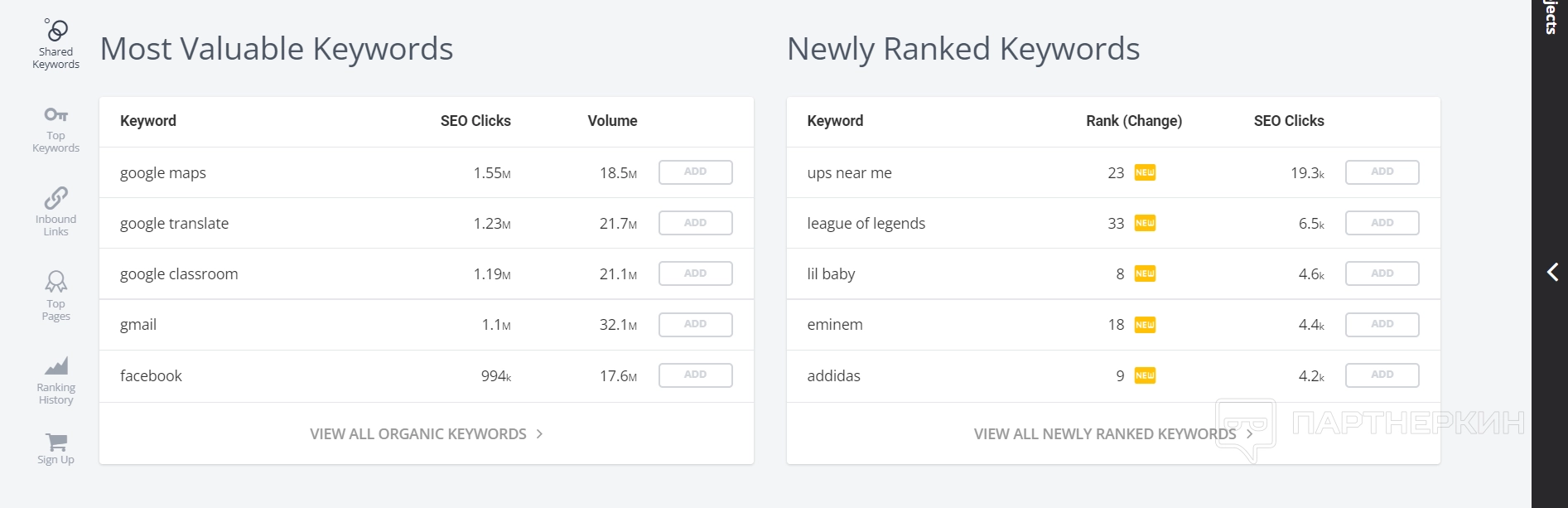 Топ ключевых слов — в этом разделе отображаются самые популярные ключевые слова, которые используют на этом сайте. Сервис также подбивает ключевые по популярности среди органического трафика и среди проплаченного.
