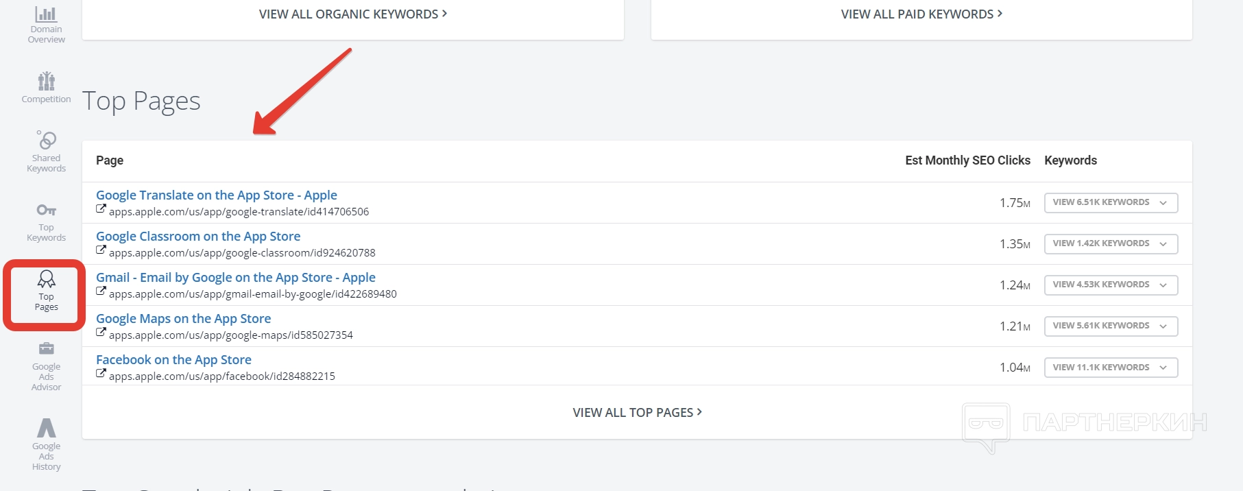 Топ страниц — в этом разделе показывают, какие самые популярные страницы есть по домену, который анализируется на сервисе. Например, мы анализировали apple.com, и самые популярные страницы на этом сайте — это приложения от Google, которые можно скачать в App Store.