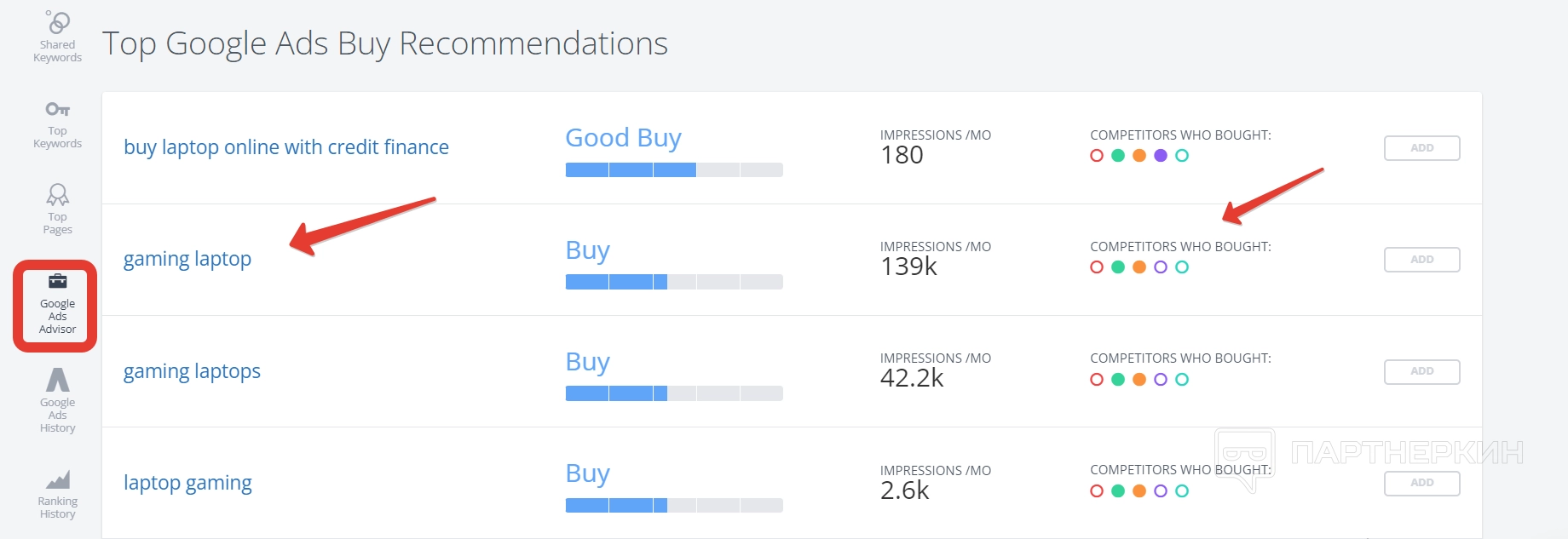 Консультант по рекламе в Google Ads — здесь можно посмотреть, какие рекомендации Google Ads дает по подбору ключевых фраз. Анализ фраз происходит на основании того, как часто их используют конкуренты. Например, фраза «игровой ноутбук» находится на втором месте по популярности среди конкурентов. Также сервис показывает, какие именно конкуренты ее использовали: